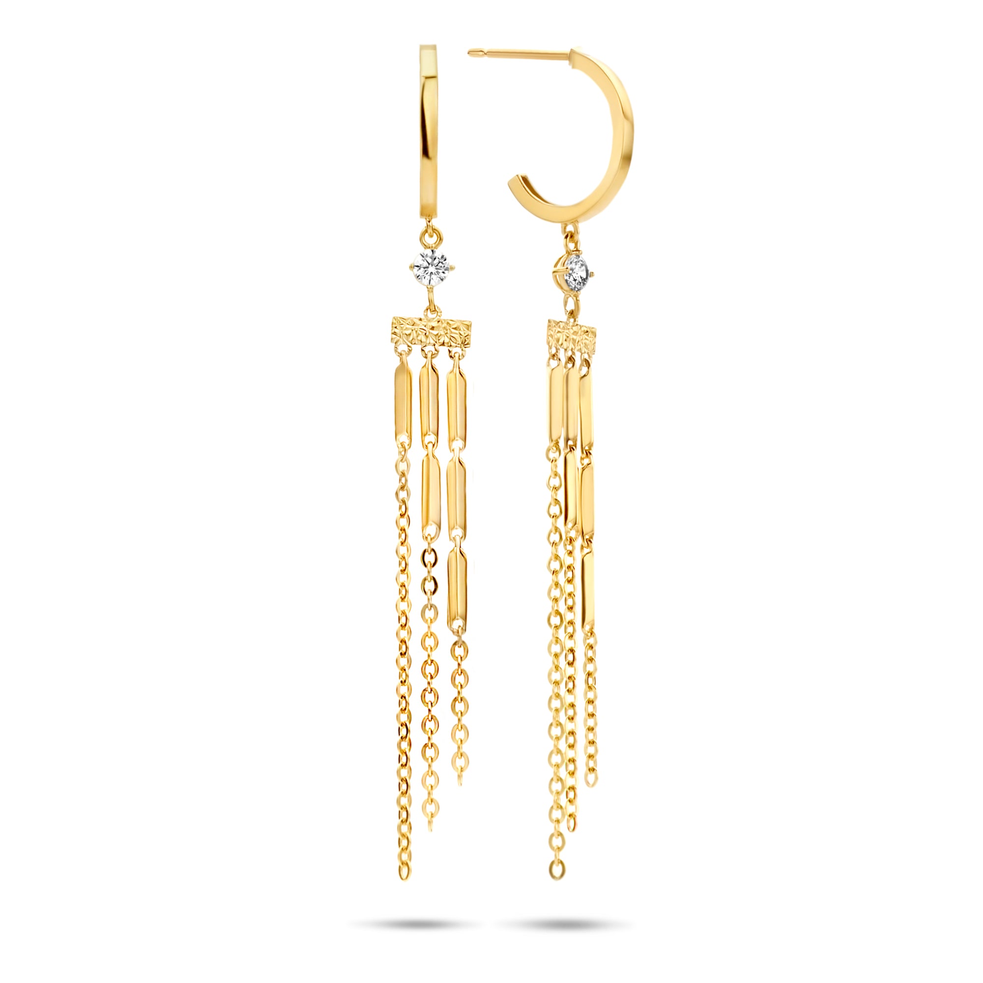Cercei din aur galben de 14 karate din colectia Gold by Siebel. Cerceii constau din jumatati de cerc cu trei lanturi atasate si pietre de zirconiu. Lanturile constau din placi si zale de ancorare. Cerceii au 6 cm lungime.