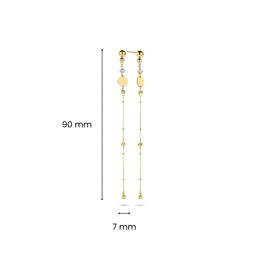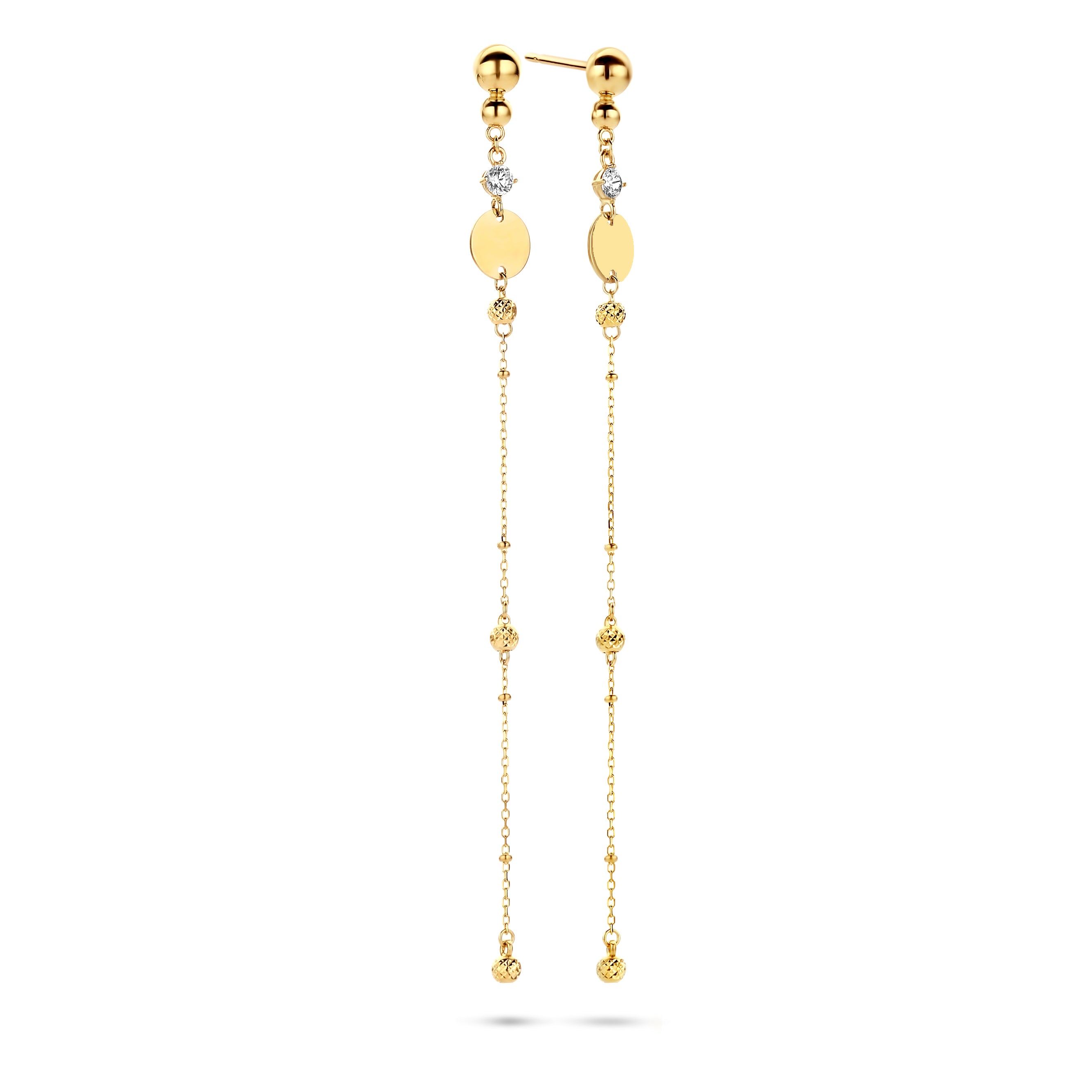 Cercei din aur galben de 14 karate din colectia Gold by Siebel. Acesti cercei au stifturi cu lanturi, bile, zirconiu si placi rotunde. Fiecare cercel are 9 cm lungime.