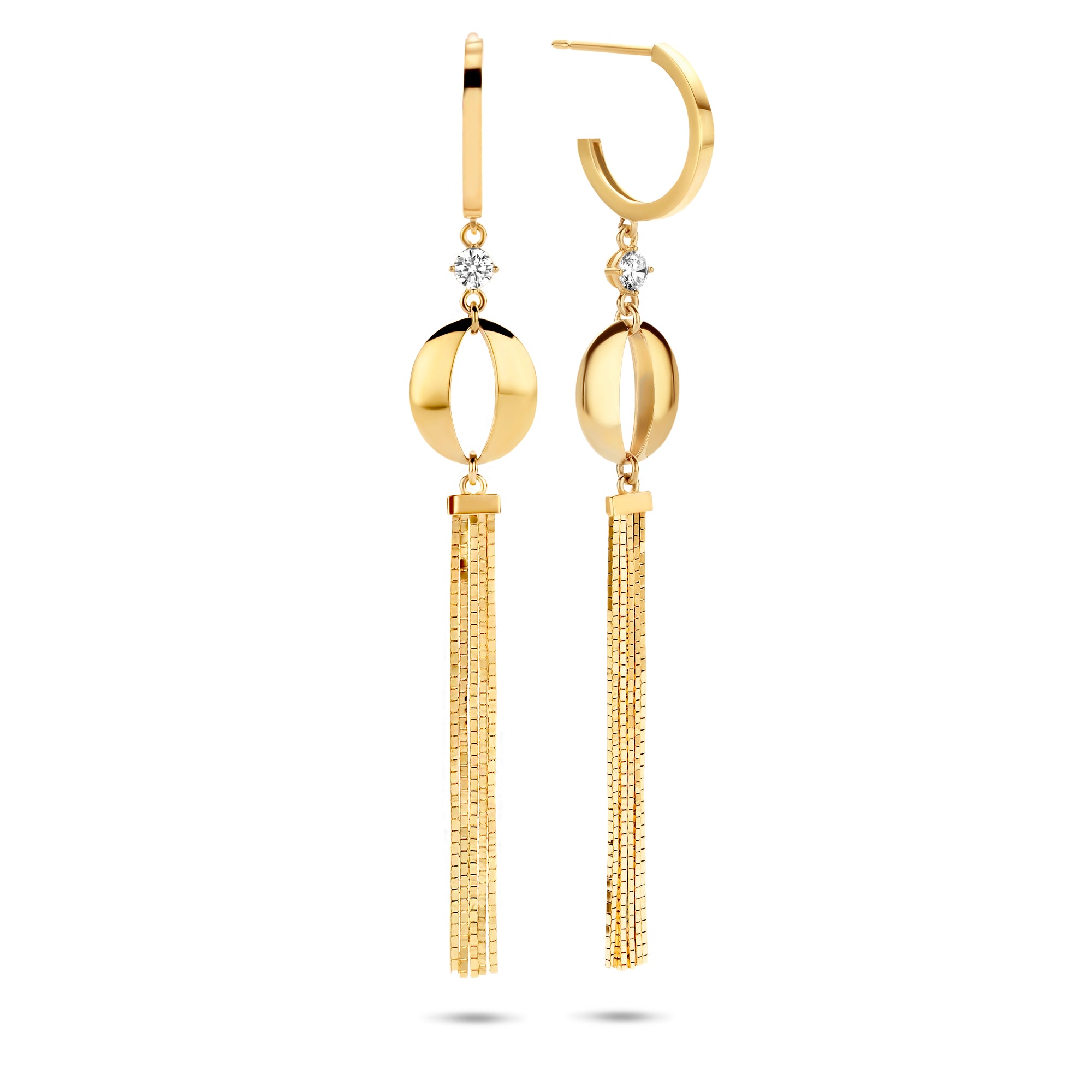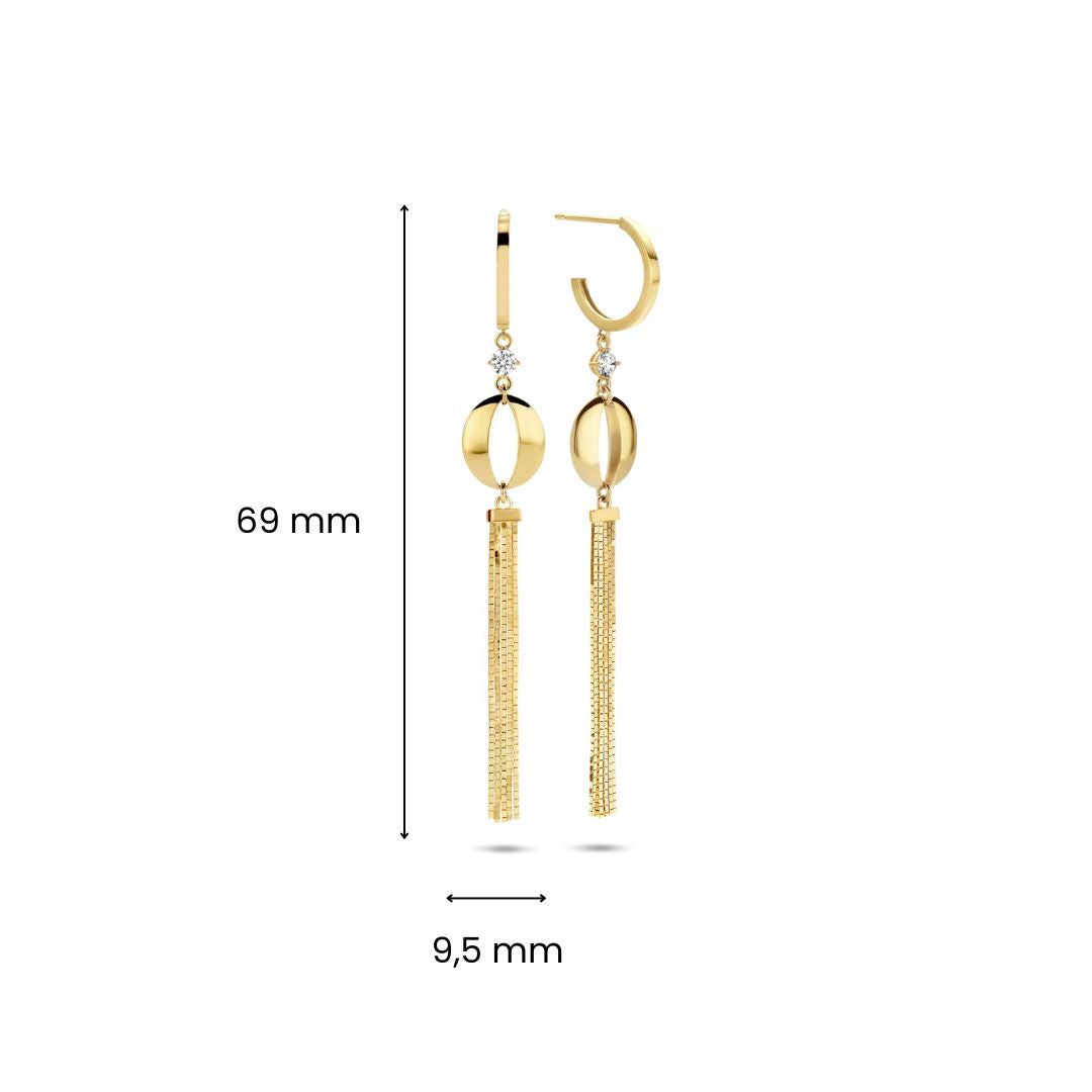 Cercei din aur galben de 14 karate din colectia Gold by Siebel. Cerceii constau din jumatate de cerc cu lanturi, placi si pietre de zirconiu atasate. Lanturile sunt realizate din zale venetiene. Cerceii au 7 cm lungime.