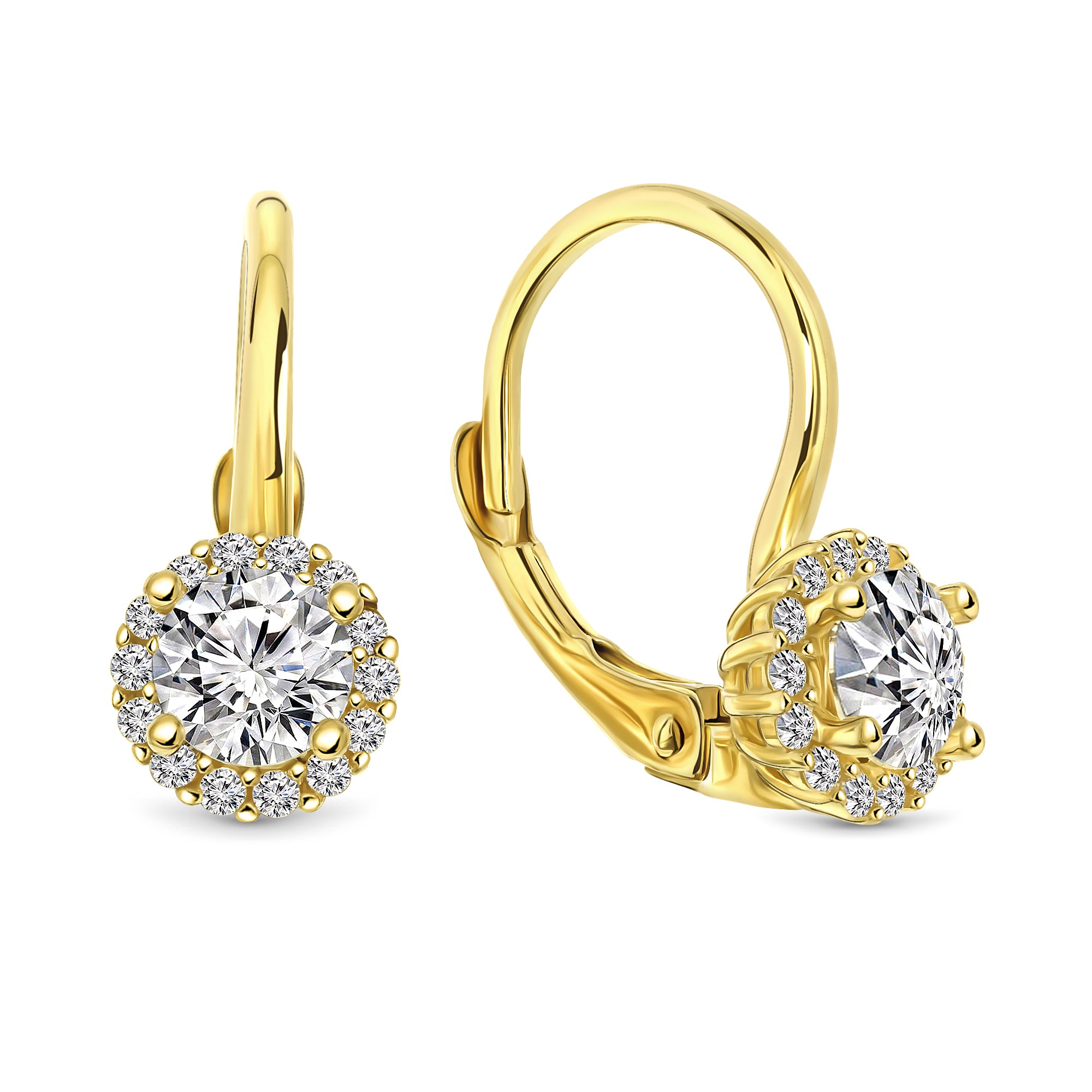 Cercei din aur galben de 14 karate din colectia Gold by Siebel. Cerceii sunt asezati intr-un anturaj in forma de floare cu zirconiu.