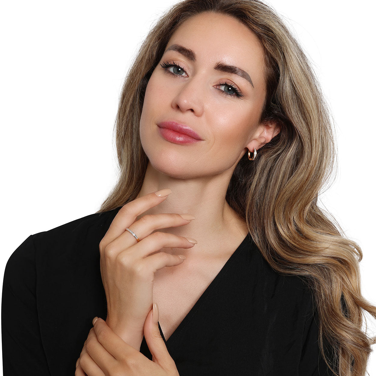 Cercei din aur galben de 14 karate de la Diamonds by Siebel. Diamantele sunt taiate stralucitor si frumos montate intr-un rand in fata. Sunt setate un total de 32 de diamante cu o greutate de 0,144 ct. Culoarea este H si claritatea este SI1. Diametrul exterior este de 15,6 mm, iar diametrul interior este de 12,9 mm. Grosimea totala a cerceilor este de 3,5 mm.