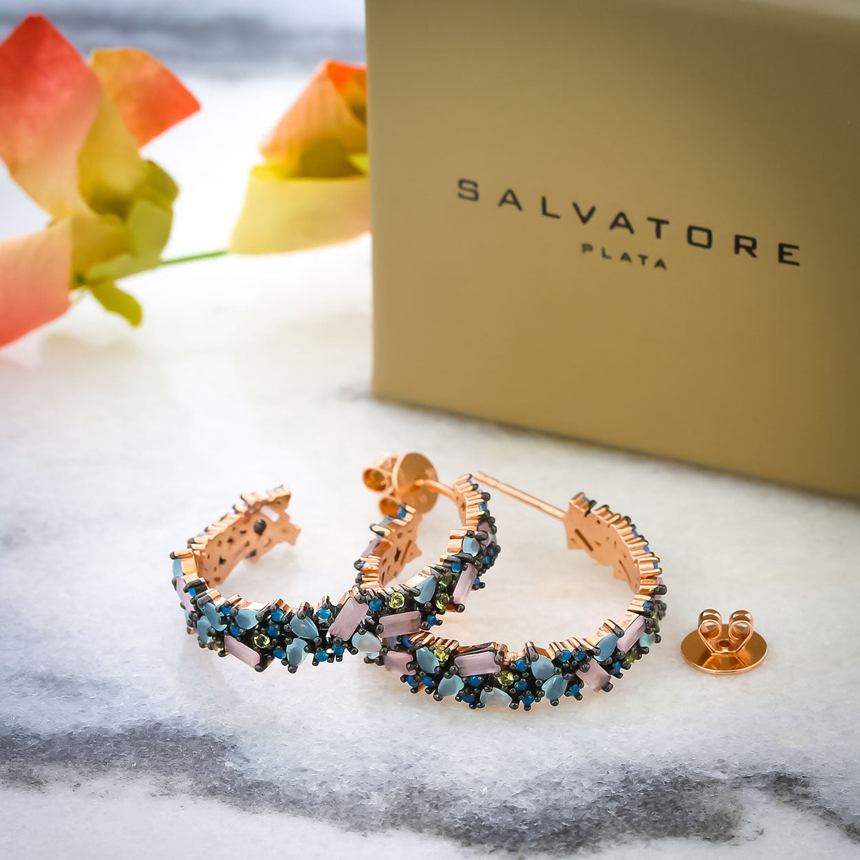 Cercei din argint 925 placat cu aur roz din colectia Salvatore Plata. Cerceii prezinta roz, albastru si verde. Diametrul cerceilor este de 2,5 cm.