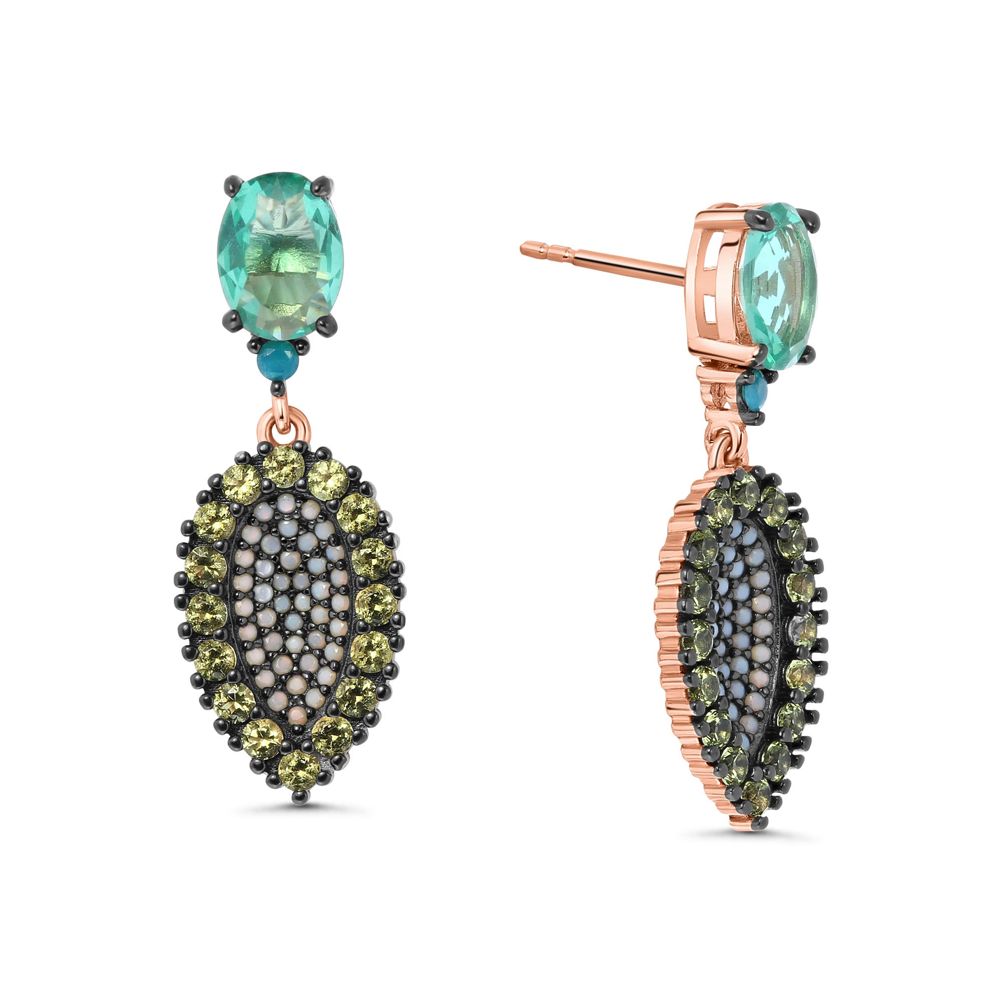 Acesti cercei placati cu aur roz, argint, sunt din colectia Salvatore Plata. Sunt finisate cu diverse cristale colorate si forme si zirconiu in albastru si verde. Amesteca si asorteaza acesti cercei cu tinuta ta preferata.