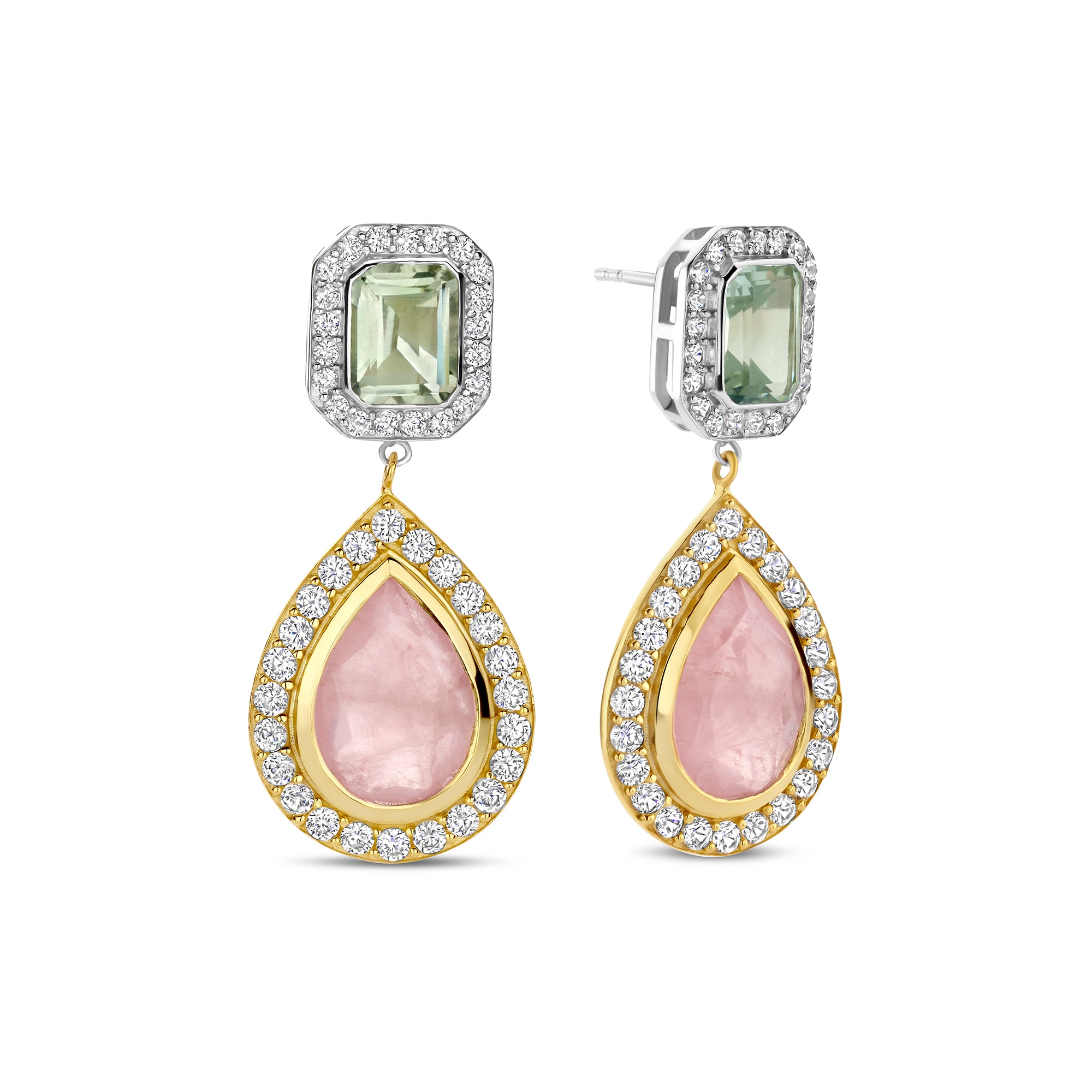 Acesti cercei din seria Caramel de la Salvatore Plata combina frumusetea naturala cu eleganta rafinata. Realizati din argint sterling placat cu aur (925), acestia fac o declaratie stralucitoare datorita jocului de culori al pietrelor semipretioase atent selectate. Combinatia dintre un ametist verde dreptunghiular si un cuart roz in forma de lacrima este incadrata cu zirconiu alb taiat briliant, care capteaza frumos lumina si adauga un plus de stralucire. Cu o lungime de 3,50 cm, acesti cercei atrage cu adevarat atentia, in timp ce culorile delicate si naturale ale pietrelor creeaza un aspect senin si feminin. Seria Caramel este inspirata de dulceata si delicatete, cu accent pe pietrele semipretioase naturale. O bijuterie rafinata cu caracter, perfecta pentru a fi combinata cu alte piese din colectia Caramel.