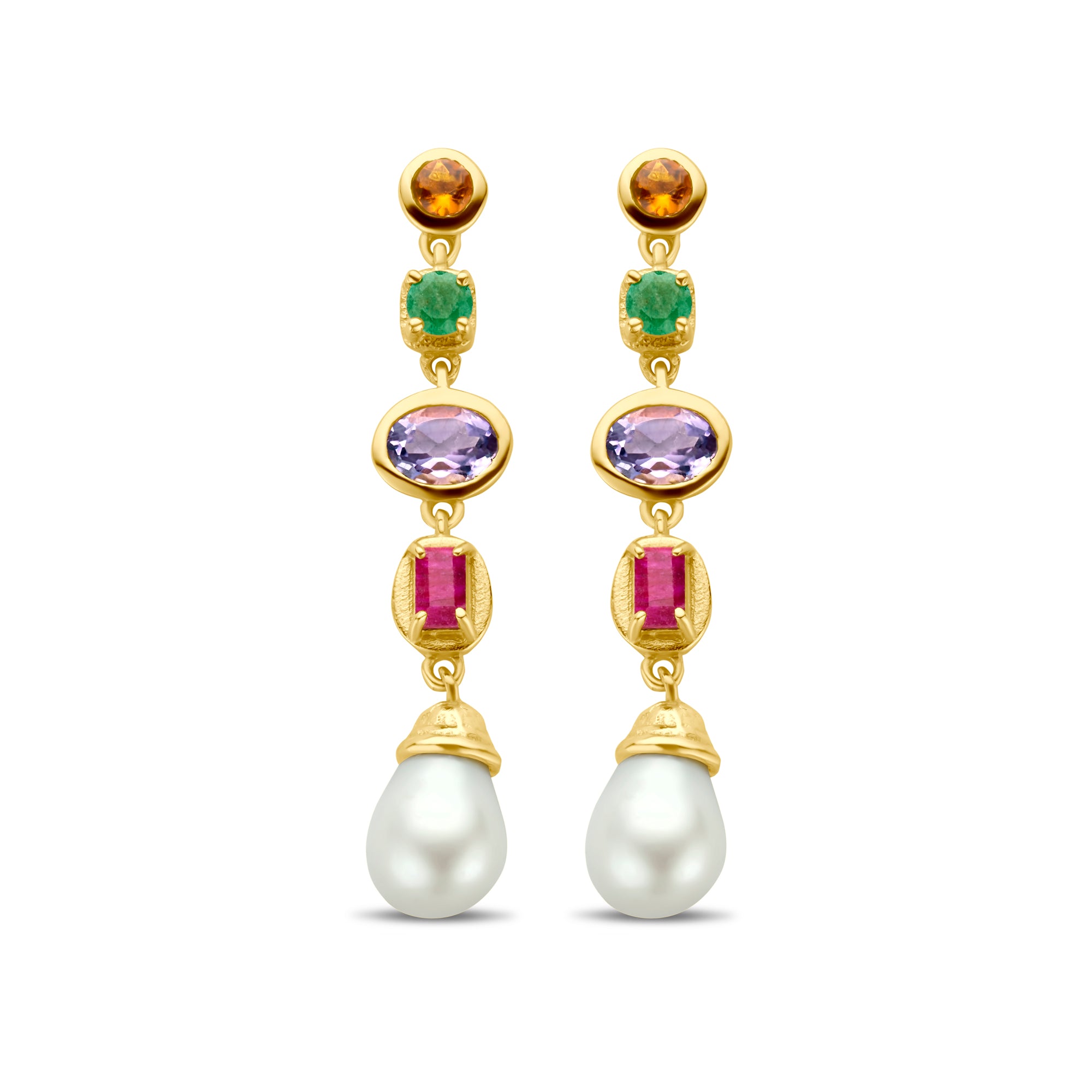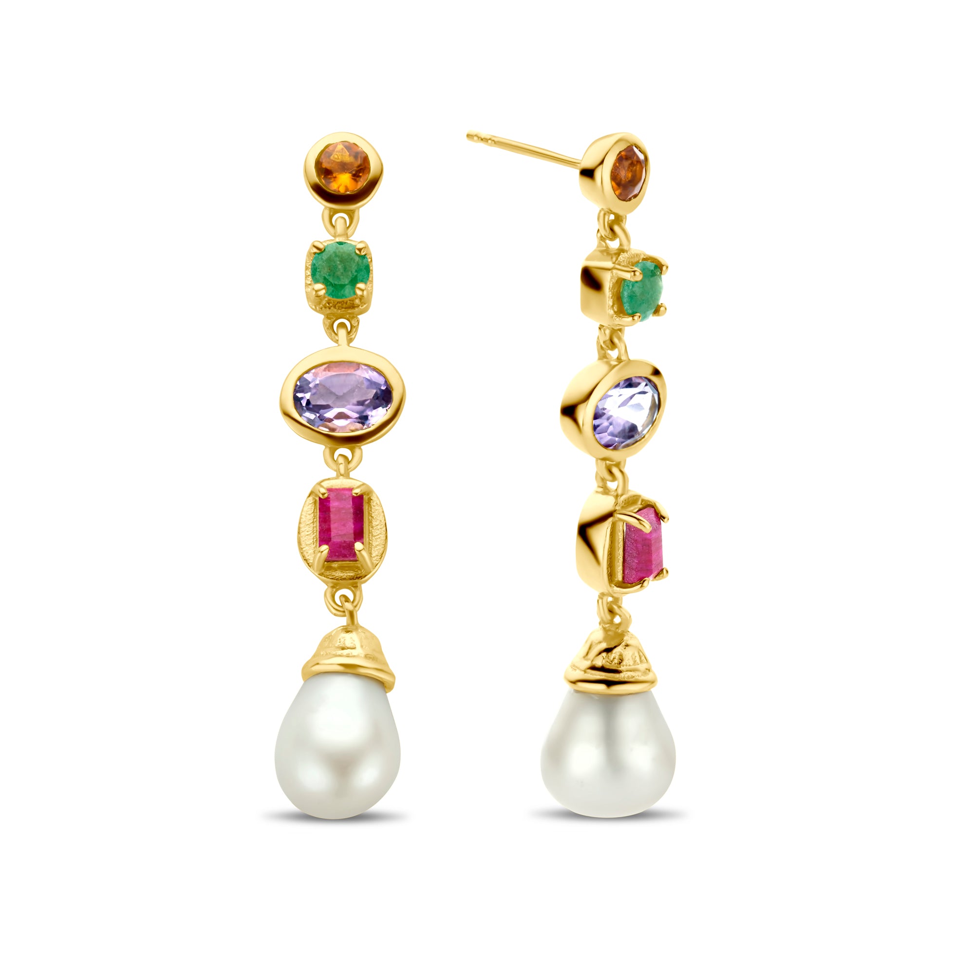 Adauga o nota vesela oricarui look cu acesti cercei Salvatore Plata. Fabricate din argint 925 si placate cu aur, sunt impodobite cu o varietate de pietre: cuart, aventurin, ametist, rubin si perle. Acest lucru creeaza un aspect unic si jucaus.