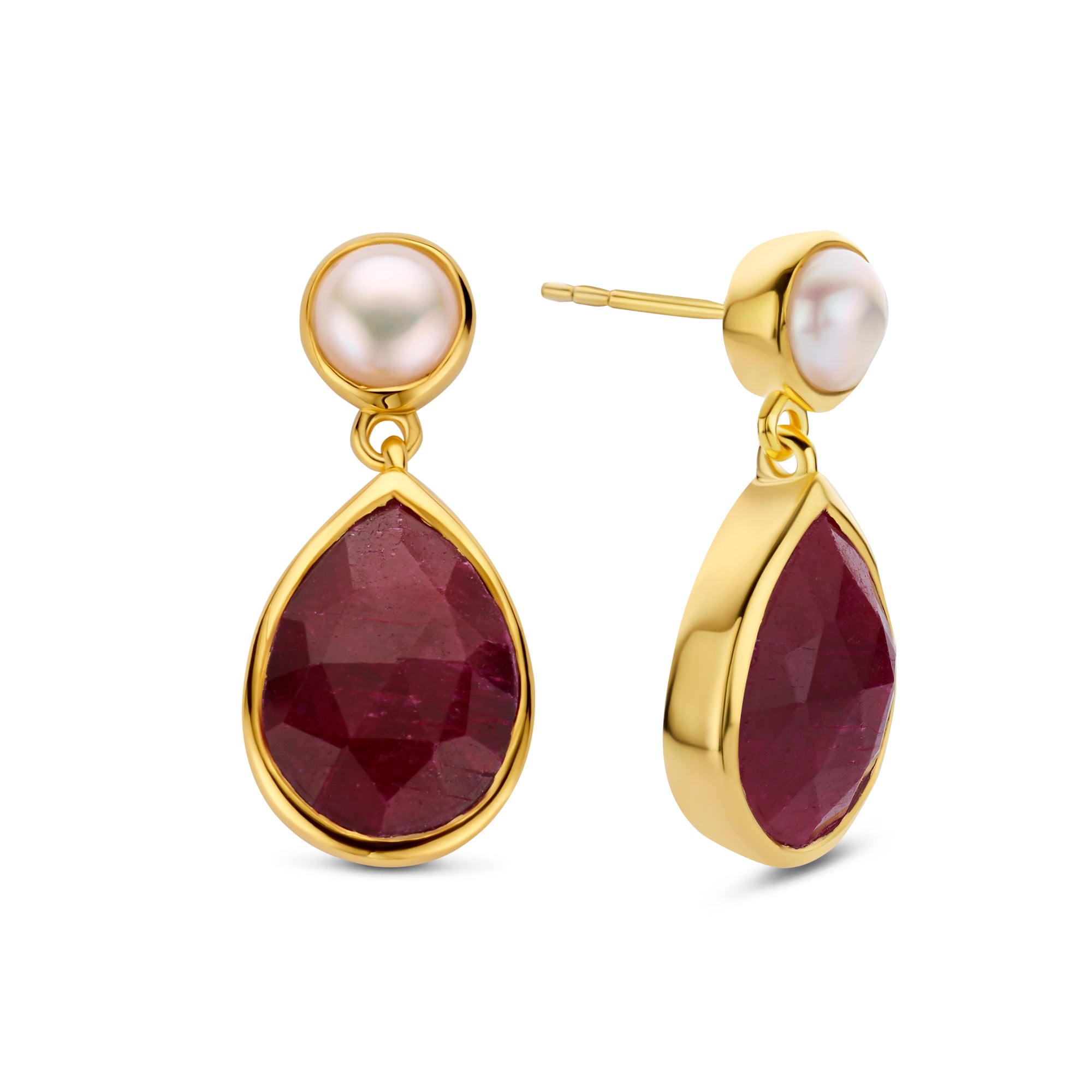 Acesti cercei delicati Salvatore sunt realizati din argint sterling si placat cu aur. Pandantivele sunt impodobite cu un rubin rosu orbitor in forma de para (10x14 mm), o piatra pretioasa cunoscuta pentru culoarea sa intensa si simbolismul pasiunii si iubirii. Perla de 3 mm adauga o nota clasica designului. Acesti cercei emana lux si eleganta, perfecti pentru ocazii speciale. Rubinul face ca acesti cercei sa fie deosebit de speciali cu aspectul sau bogat si puternic!