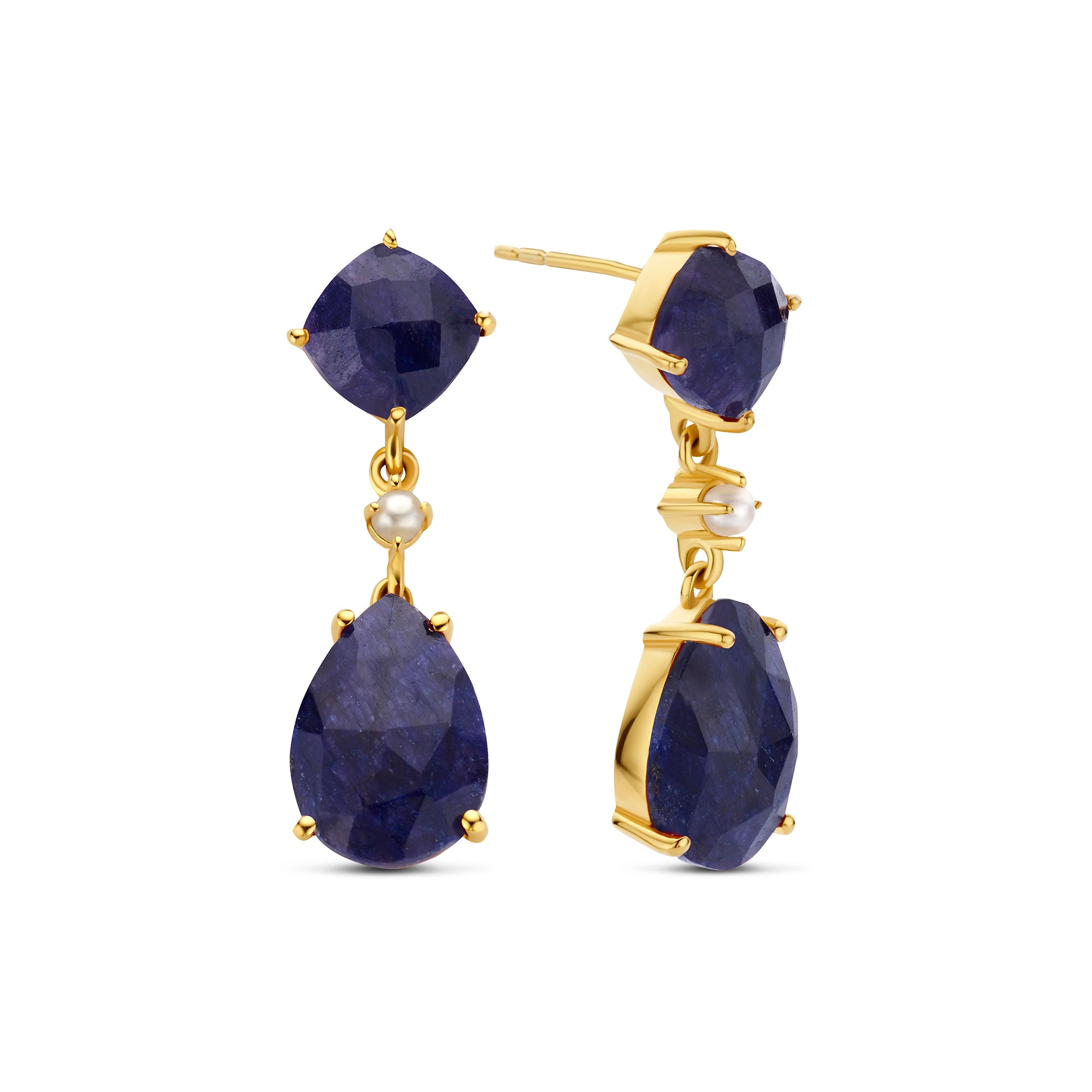 Acesti cercei eleganti Salvatore sunt confectionati din argint sterling, placati cu aur galben pentru un aspect luxos. Sunt impodobite cu patru frumoase safire albastre, doua in forma patrata de 8 mm si doua in forma de para de 10x14 mm. Safirele, cunoscute pentru culoarea albastru intens si simbolismul intelepciunii si loialitatii, adauga un accent izbitor. Sunt fixate si doua perle mici, oferind un finisaj rafinat. Perfect pentru cei care cauta o bijuterie gratioasa si atemporala.