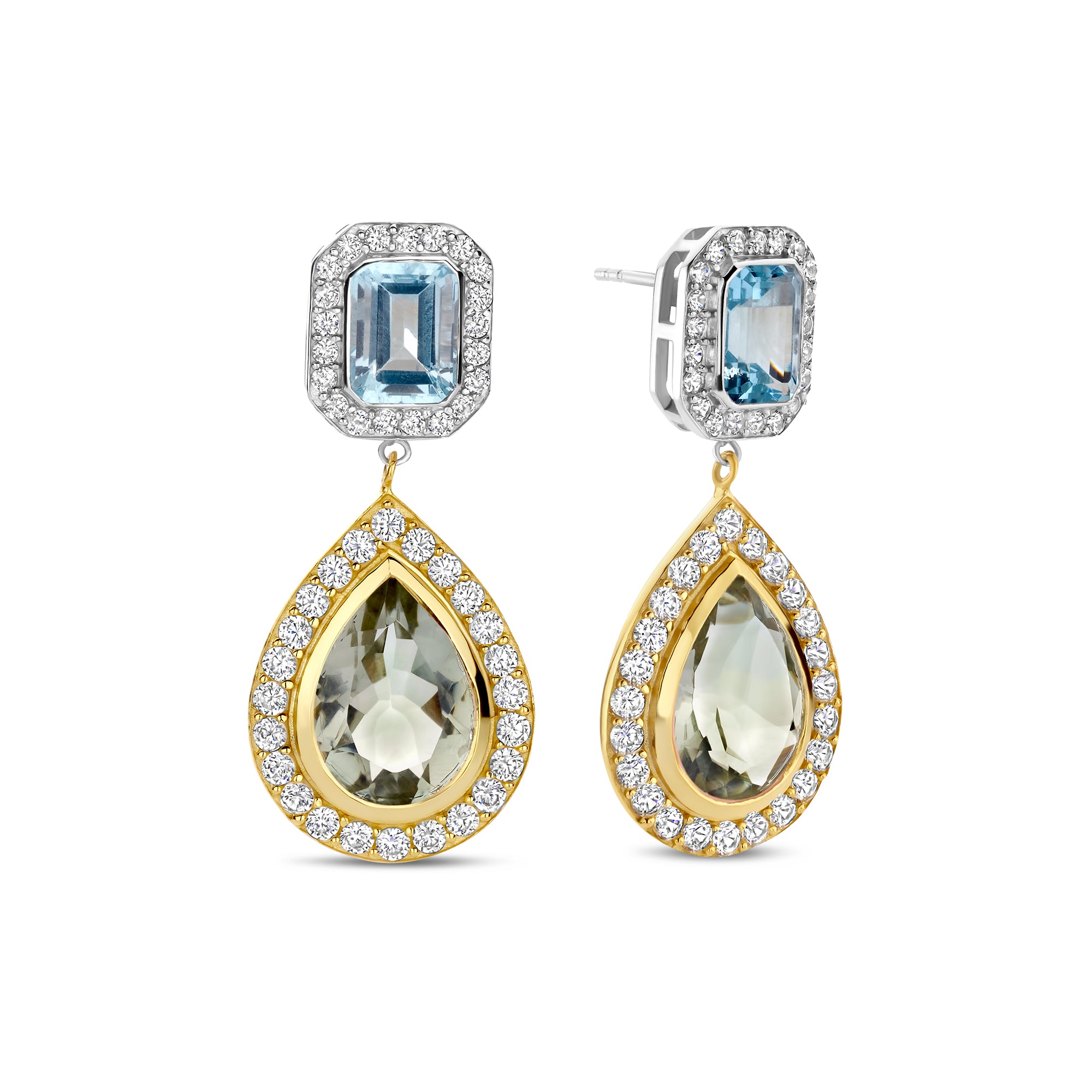 Acesti cercei din colectia Caramel de la Salvatore Plata sunt o completare colorata si sofisticata a colectiei tale de bijuterii. Realizati din argint sterling placat cu aur 925, acesti cercei combina un topaz albastru dreptunghiular cu un ametist verde in forma de lacrima, ambele inconjurate de un pavé orbitor de zirconiu cubic alb taiat briliant. Cu o lungime de 3,5 cm, aceste piese sunt o declaratie izbitoare, dar eleganta. Combinatia vibranta de culori emana prospetime si eleganta, in timp ce finisajul de inalta calitate asigura un aspect atemporal. Poarta-i individual sau asorteaza-i cu piese asortate din colectia Caramel pentru un ansamblu armonios.