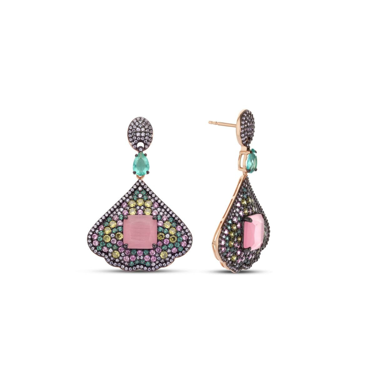 Cercei argintiu placati cu aur roz in forma de evantai cu cristal roz laptos si zirconii verzi, roz, mov si galben placat cu ruteniu.