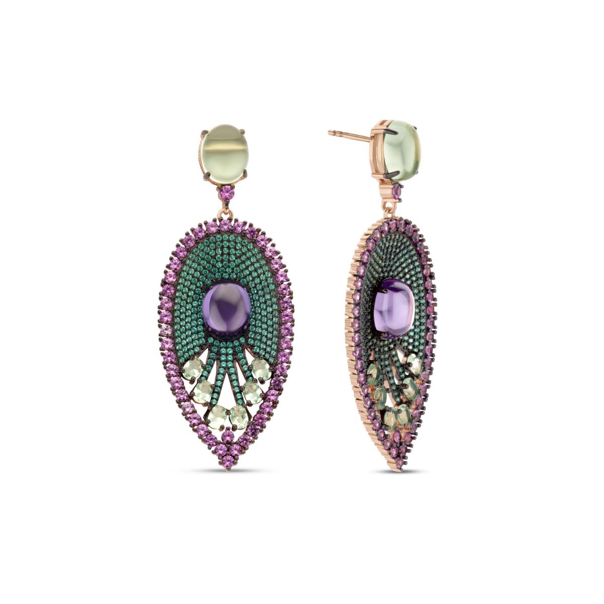 Cercei in forma de frunza placati cu aur roz, argint, cu cristale mov si verzi si zirconiu verde si roz.. Placat cu ruteniu