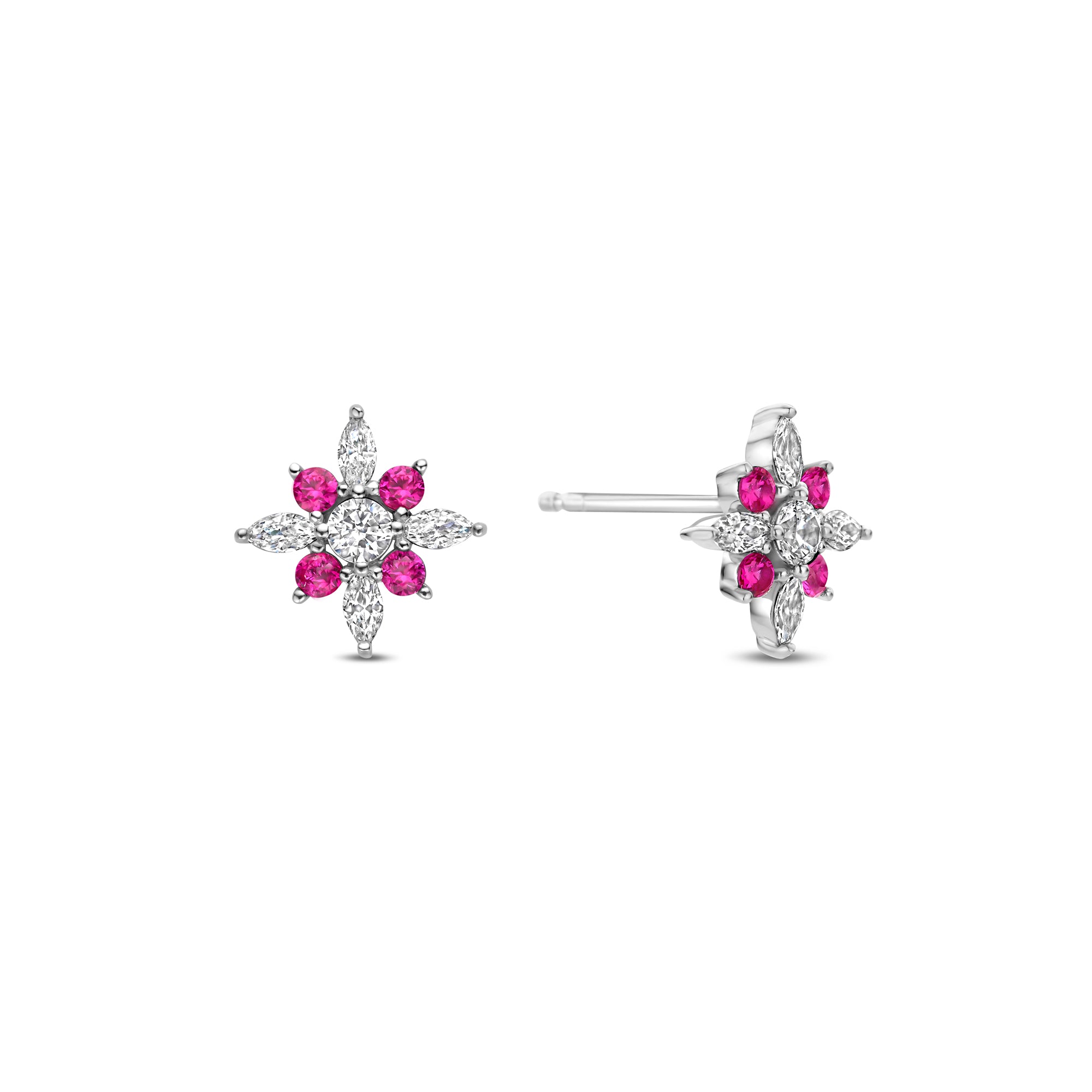 Acesti cercei tip stift din Colectia Audrey sunt confectionati din argint 925 si placati cu rodiu pentru o stralucire de lunga durata si o protectie impotriva patarii. Sunt impodobite cu zirconiu cubic rosu si alb, dispuse in forma de fulg de zapada. Aceasta combinatie de materiale si culori confera cerceilor un aspect elegant, perfect pentru a adauga un strop de culoare look-ului tau, atat ziua, cat si noaptea.
