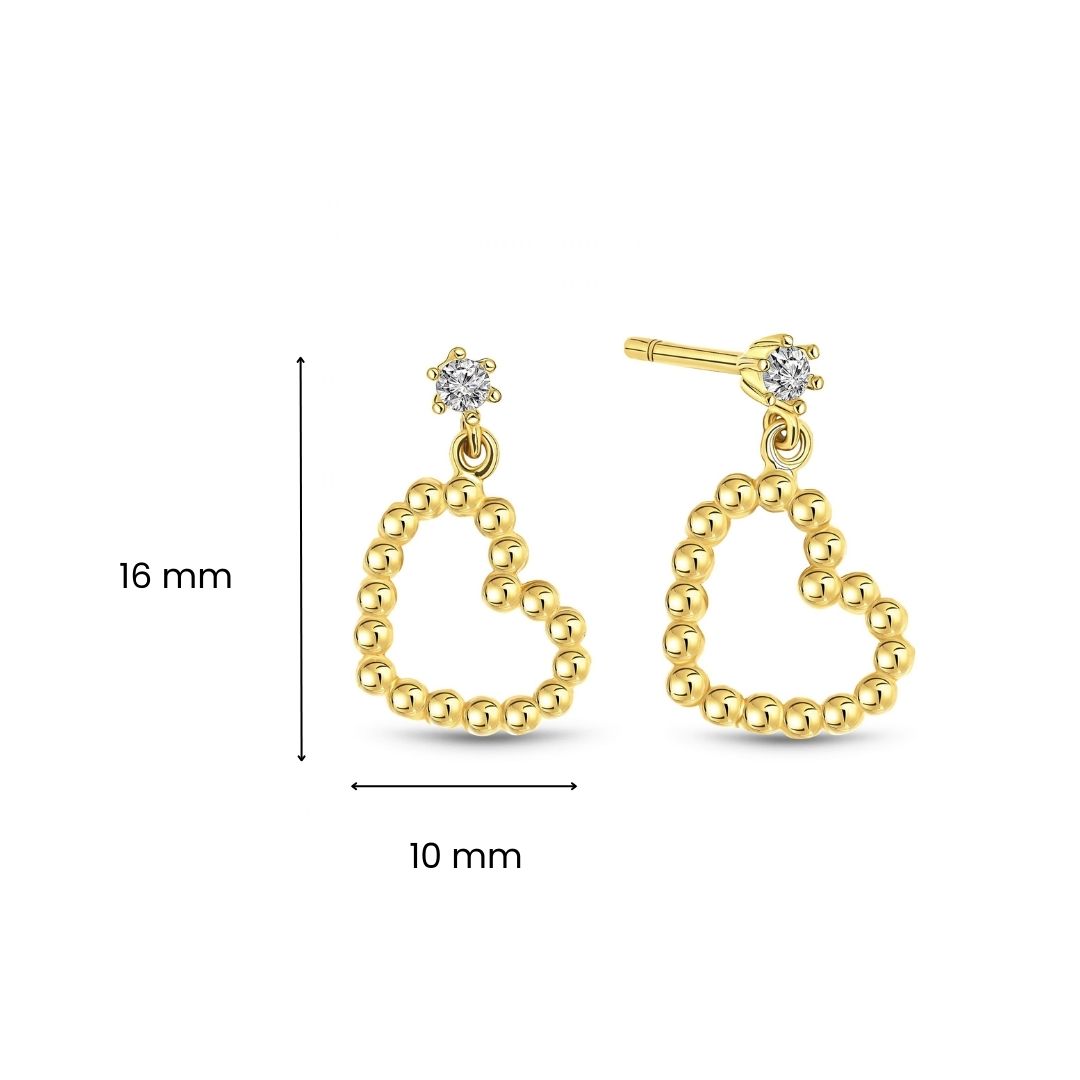 Cercei din aur galben de 14 karate cu pietre de zirconiu din colectia Valentina. Pandantivele sunt in forma de inima si prezinta margele de aur. Stifturile sunt fixate cu pietre de zirconiu. Cerceii se potrivesc cu colierul din colectia Valentina.
