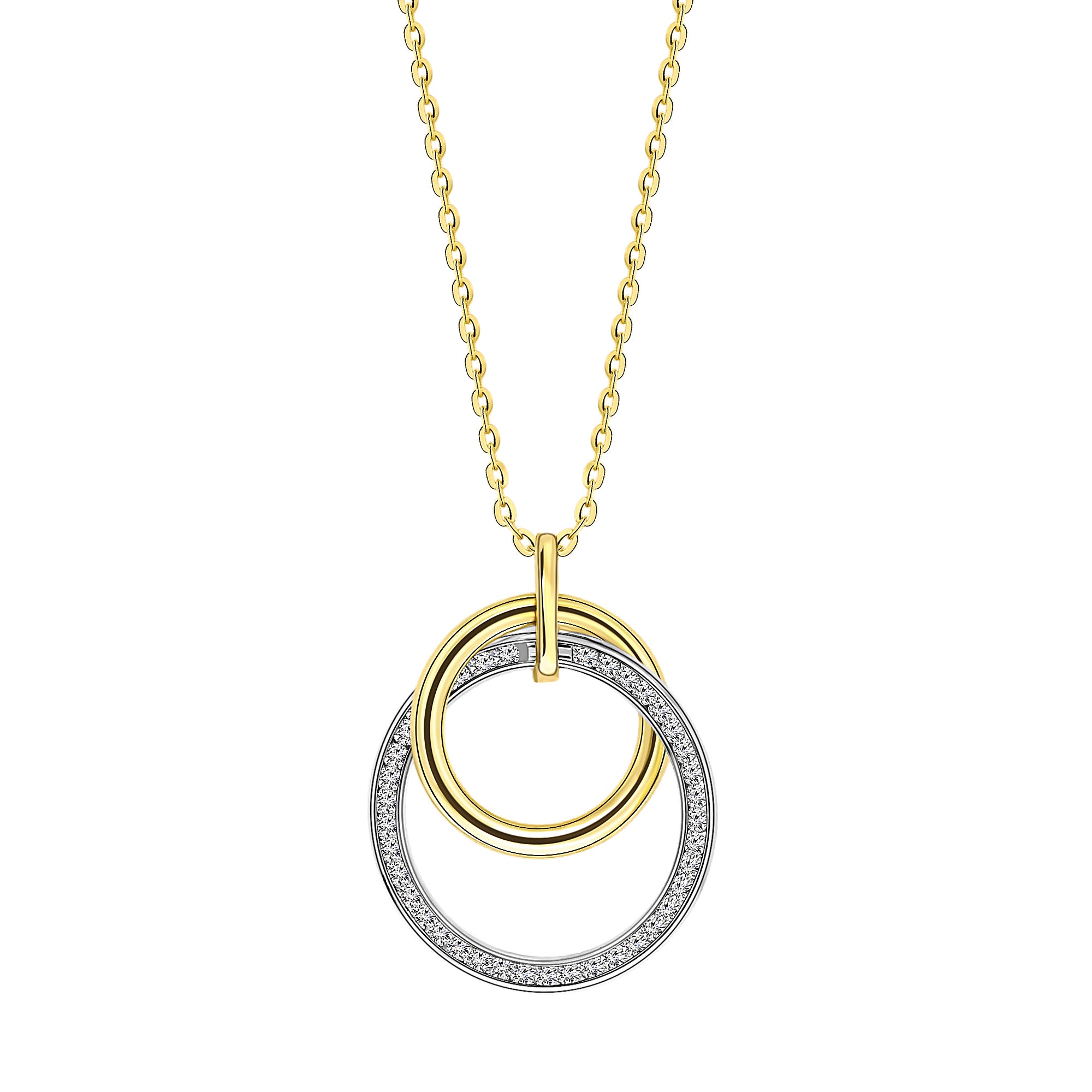 Colier bicolor din colectia Twinline. Colierul prezinta un cerc de aur galben si un cerc de aur alb inserati cu pietre de zirconiu.
