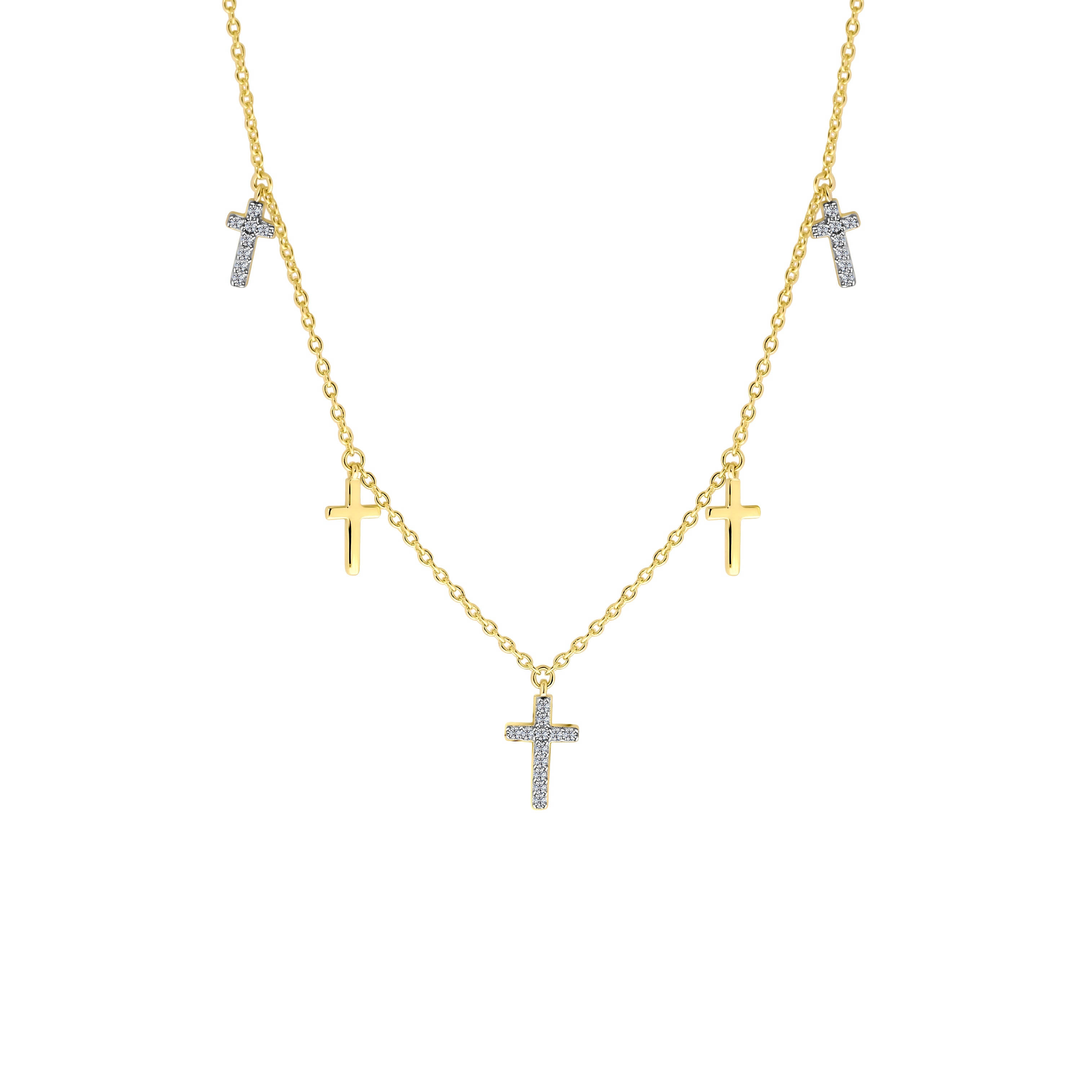 Acest colier la moda este din colectia by Zoë. Fabricat din argint 925 si placat cu aur, masoara 43 cm in lungime si prezinta pandantive in forma de cruce, asezate cu pietre de zirconiu. Amesteca si asorteaza bijuterii din colectia by Zoë pentru a adauga o nota indrazneata look-ului tau!