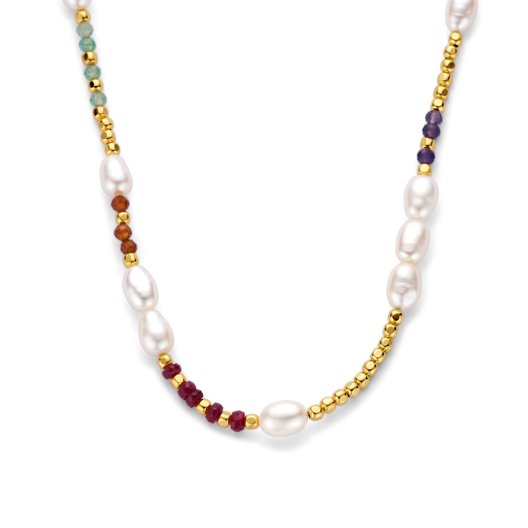Acest colier emana vara. Culorile vesele ale margelelor de piatra adauga o nota de culoare oricarui look, in timp ce perla mai mare adauga o nota jucausa. Fabricate din argint 925 si placate, margelele sunt realizate din cuart, aventurin, ametist, rubin si perla.