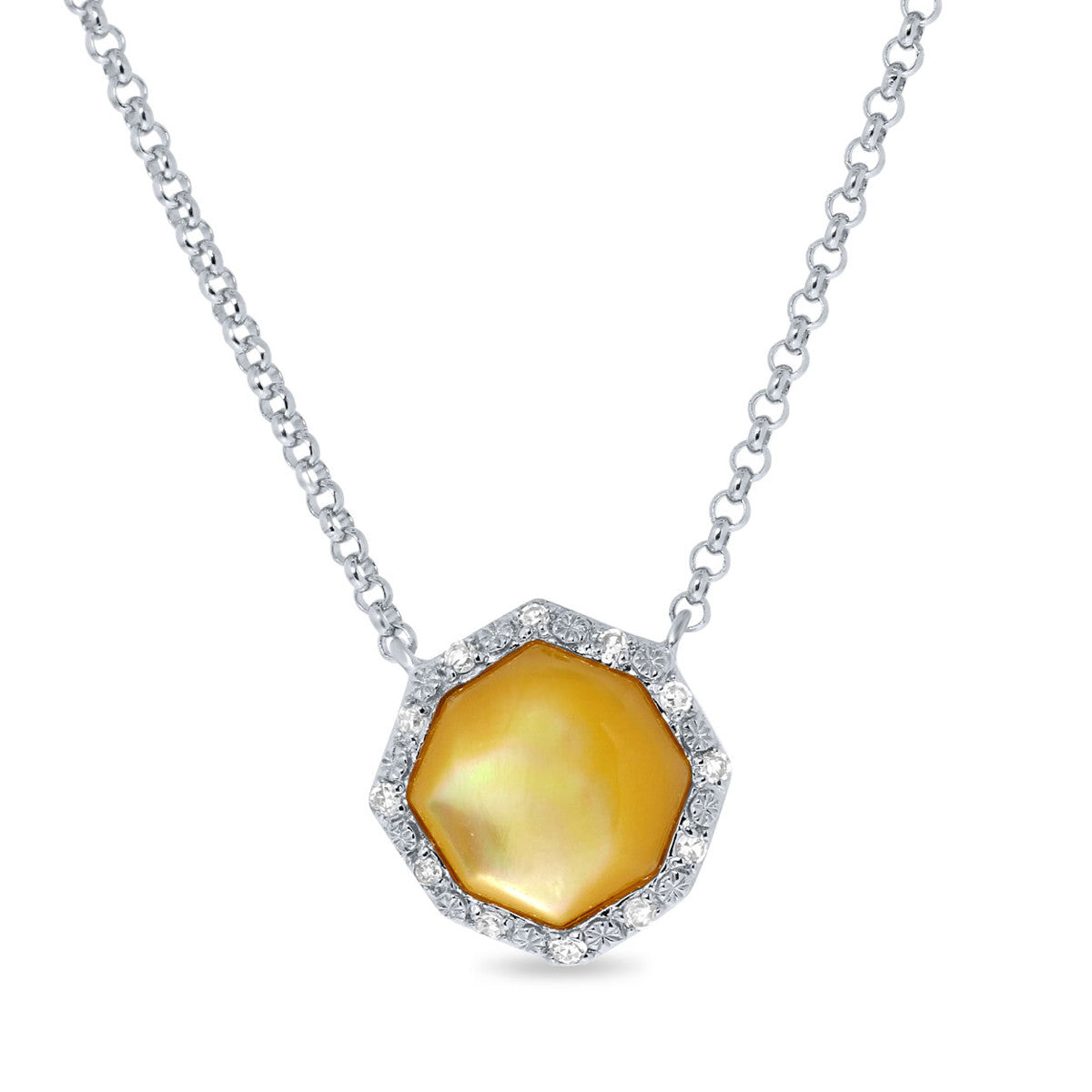Colier din aur alb din colectia Aurora de la Diamonds by Siebel. Pandantivul este sertat cu diamante si sidef.
