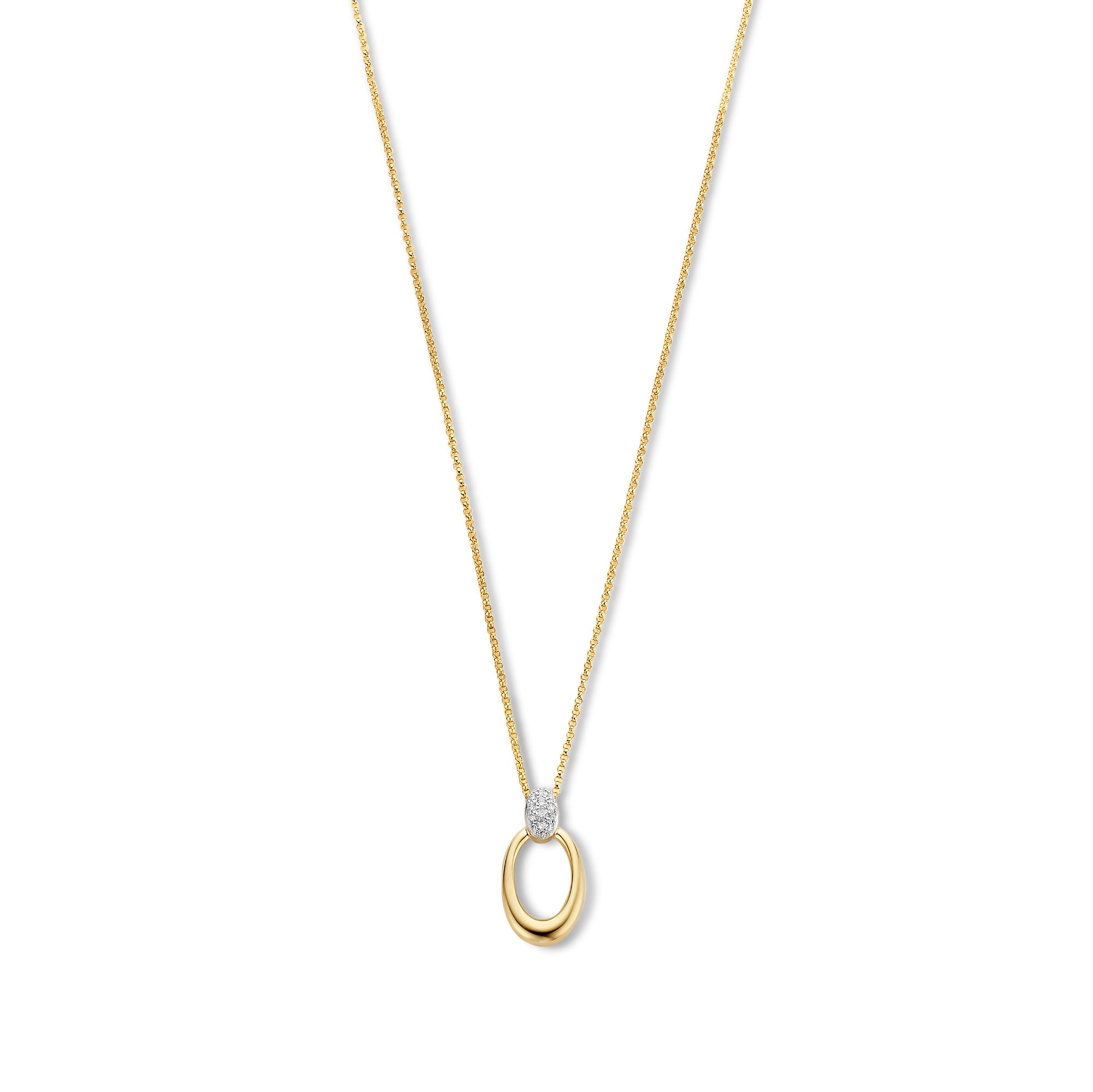 Colier din aur galben cu un oval si diamante din colectia Diamonds by Siebel. Fabricat din aur galben de 14 karate, colierul este sertat cu 13 diamante stralucitoare. Pandantivul are o forma ovala, cu un finisaj neted, iar ochiul este fixat cu diamante uimitoare taiate stralucitor. Asociaza colierul cu alte piese din colectie pentru a-ti completa look-ul.