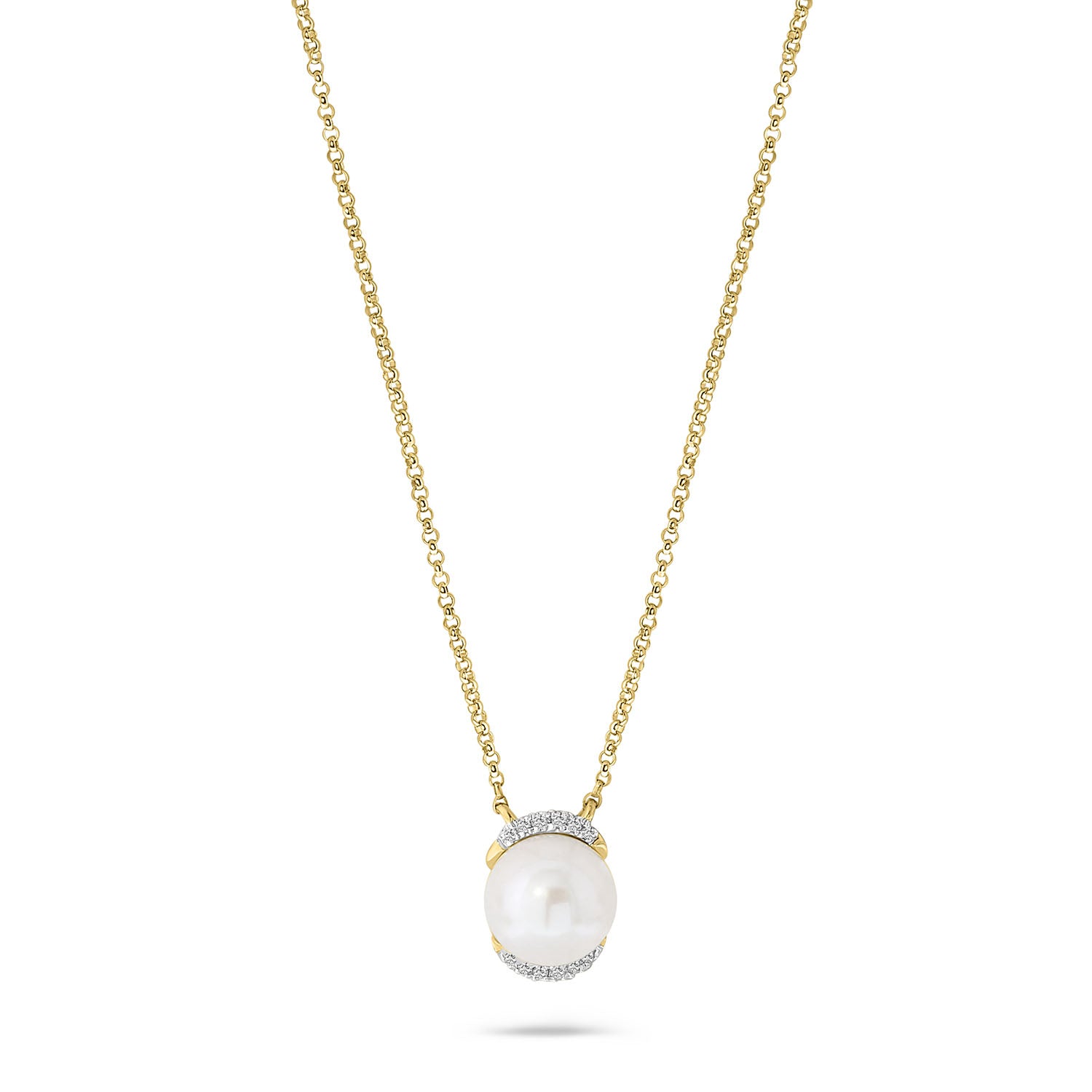 Acest colier elegant din colectia Diamonds by Siebel este realizat din aur galben de 14 karate si emana rafinament clasic. Pandantivul are o frumoasa perla alba, incadrata de 12 diamante taiate stralucitor. Combinatia dintre stralucirea moale a perlei si stralucirea subtila a diamantelor face ca aceasta piesa sa atraga privirile atemporale. Colierul masoara 450 mm lungime - perfect pentru un look elegant, feminin.