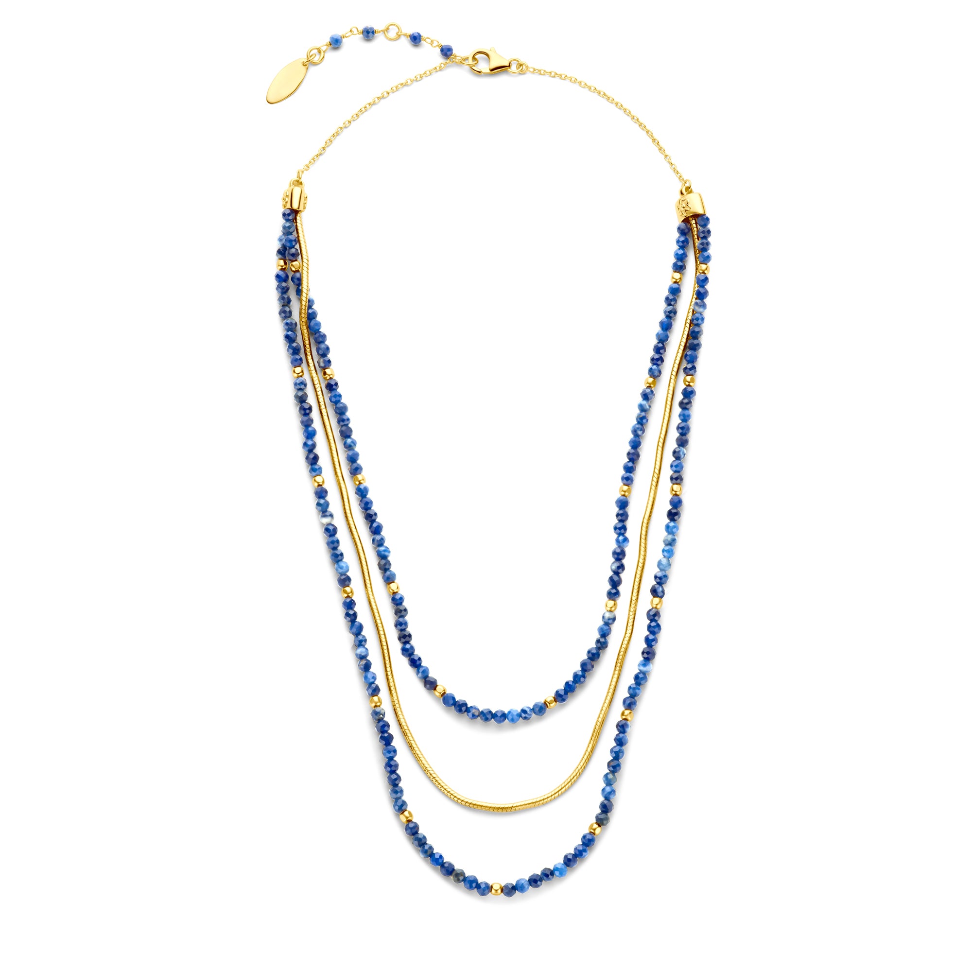 Acest colier jucaus cu margele de la Salvatore Plata este realizat din argint 925 si este placat cu aur. Margelele sunt realizate din sodalit si au o culoare profunda, atemporala. Colierul este format din trei suvite, fiecare cu o lungime diferita.