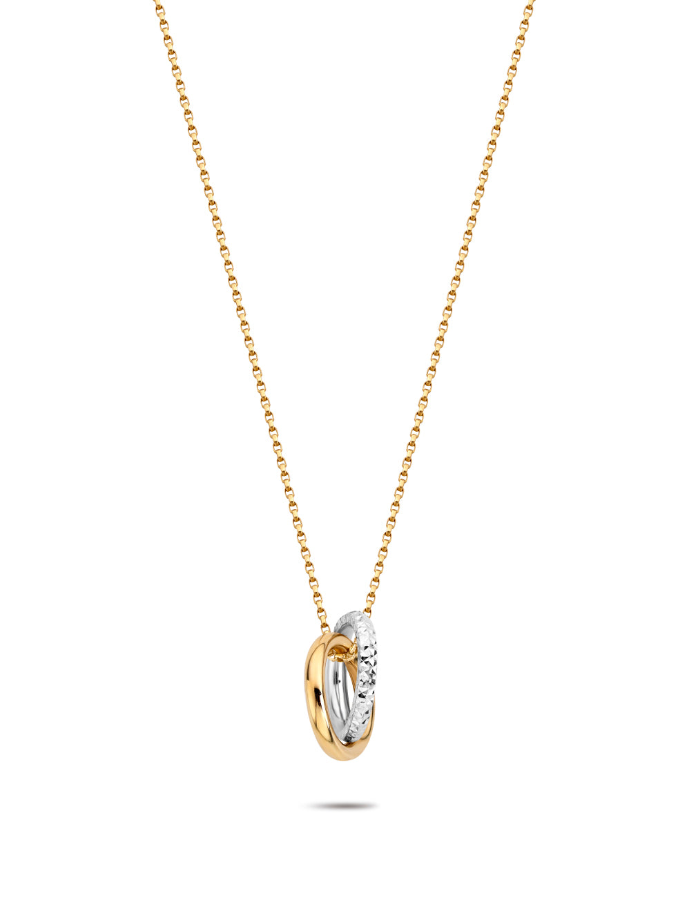 Colier din aur de 14 karate cu pandantiv din colectia Twinline. Pandantivul are un cerc de aur alb si un cerc de aur galben.