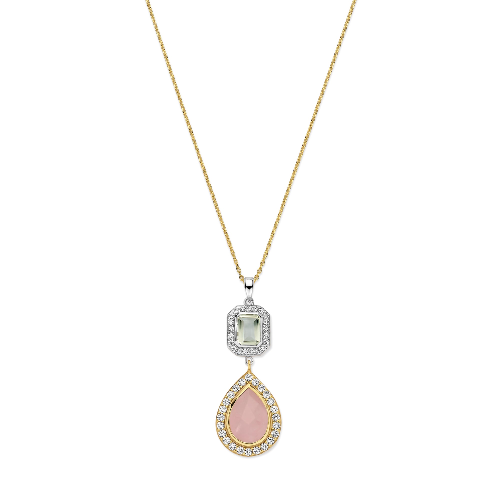 Acest colier din colectia Caramel de la Salvatore Plata emana o delicatete rafinata, inspirata de frumusetea naturala a pietrelor semipretioase. Designul prezinta un ametist verde dreptunghiular, asociat cu un cuart roz in forma de lacrima, ambele incadrate cu zirconiu alb stralucitor, taiat briliant. Realizat din argint sterling placat cu aur (925) cu accente subtile de rodiu, pandantivul atarna de un lant elegant de 40 cm, cu o extensie de 5 cm. Combinatia delicata de culori verde si roz confera acestei piese un aspect feminin si senin. Se asorteaza perfect cu bijuteriile asortate din colectia Caramel de la Salvatore Plata.