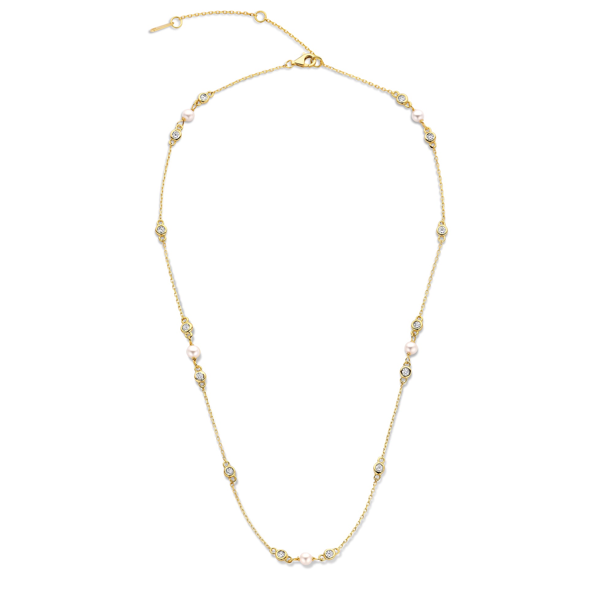 Adauga o nota de eleganta si stralucire look-ului tau cu acest colier Salvatore Plata. Fabricat din argint 925 si placat cu aur, are trei perle mici si opt pietre de zirconiu. Este usor de combinat cu alte coliere si bijuterii din colectie.