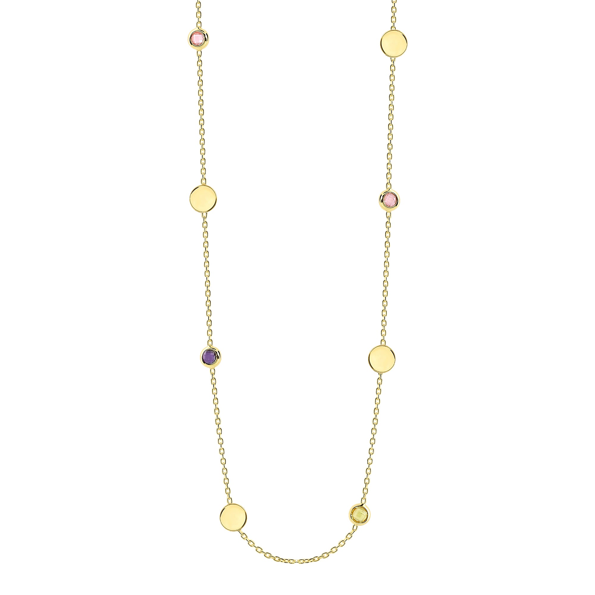 Colier din aur galben din colectia Sue Ann. Colierul alterneaza placi rotunde de aur cu zirconiu colorat.