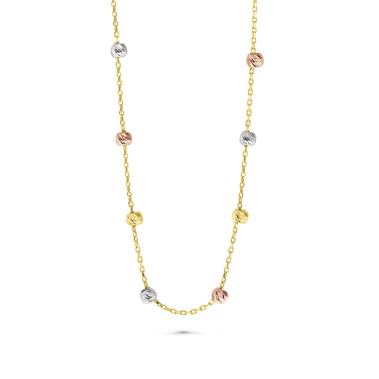 Colier tricolor din colectia Gold by Siebel. Fabricat din aur galben, trandafir si alb de 14 karate, colierul are un finisaj taiat cu diamant. Colierul are 50 cm lungime. Combinati-l cu alte bijuterii din colectie.
