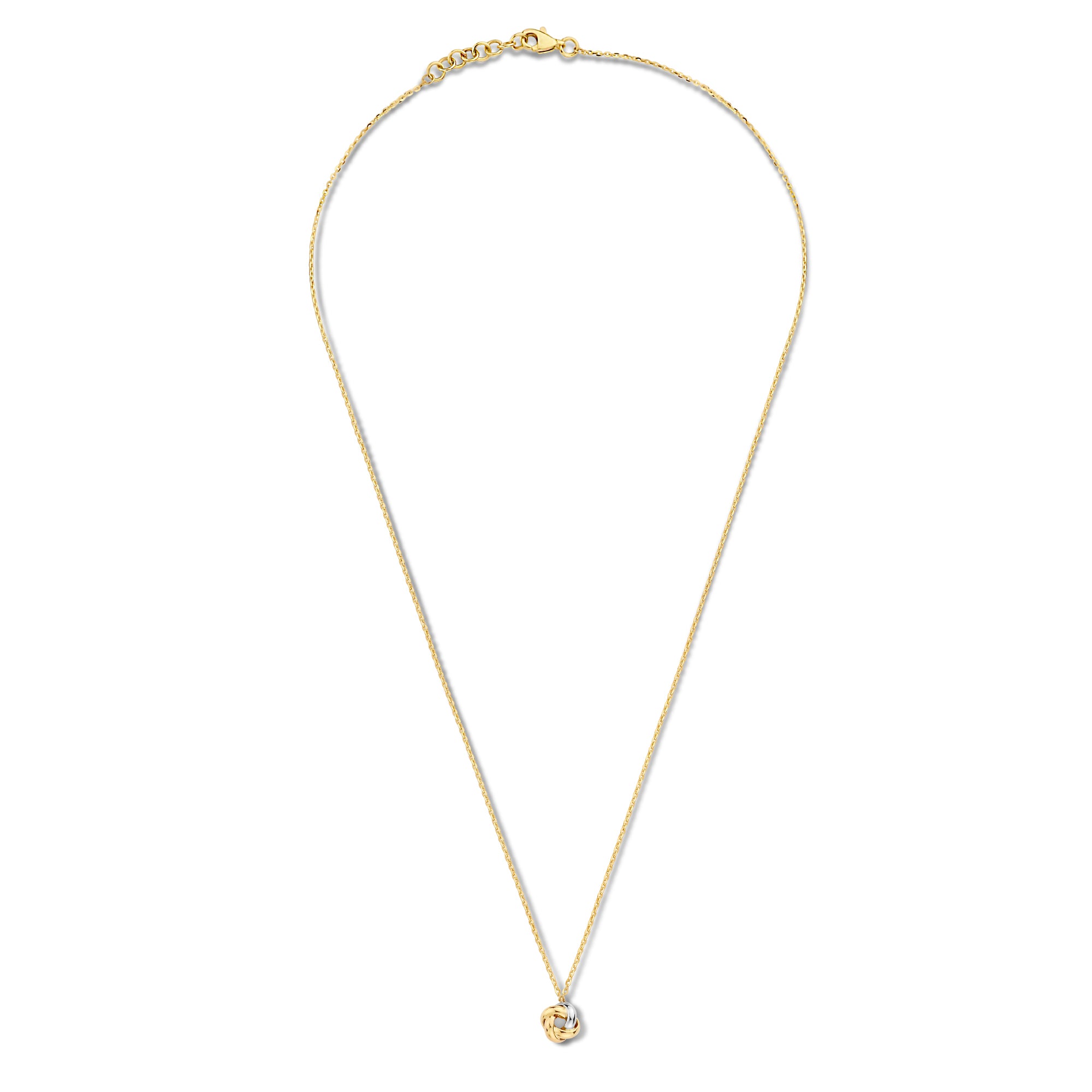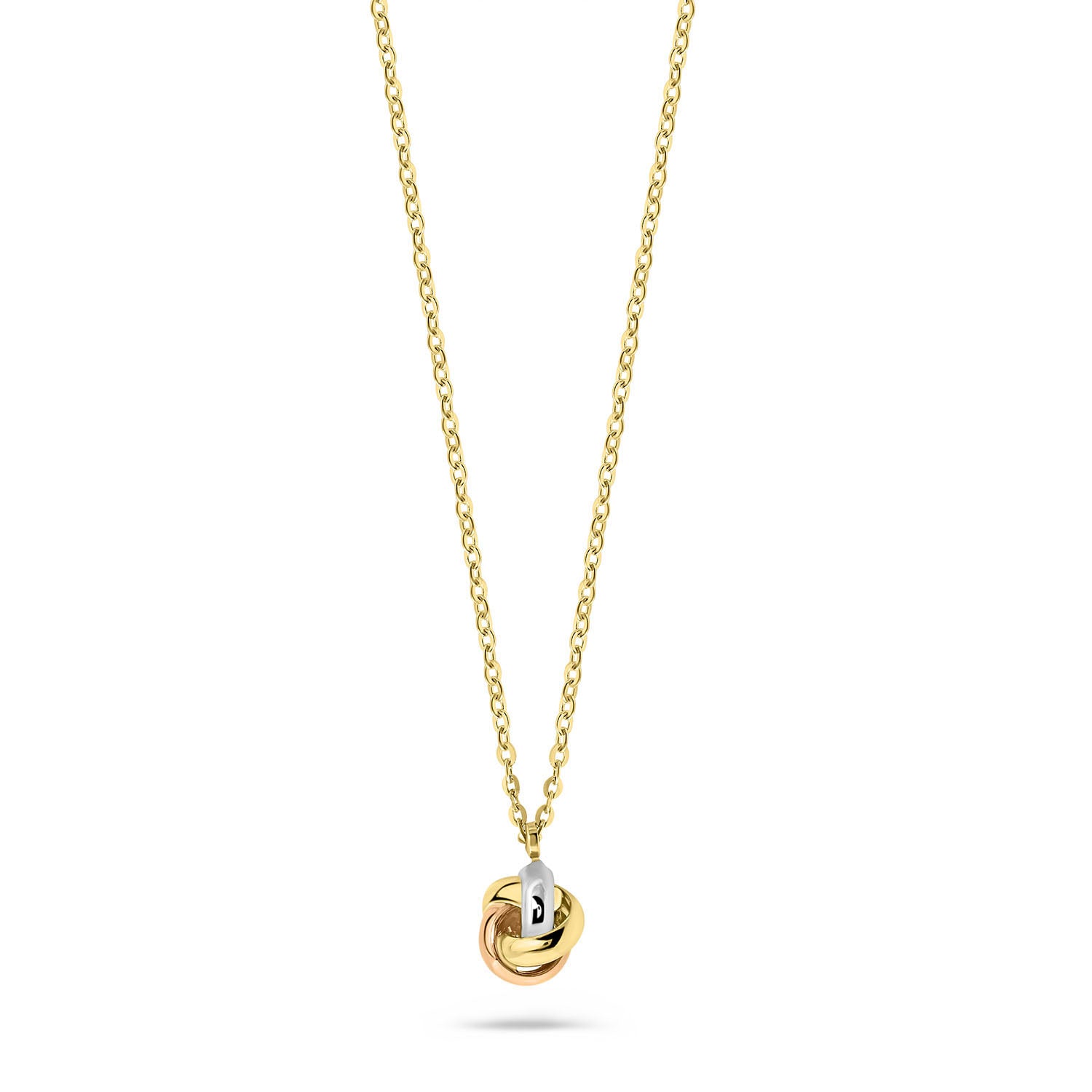 Colier din aur galben din colectia Twinline. Pandantivul are un cerc de aur roz si aur galben si un cerc de aur alb.