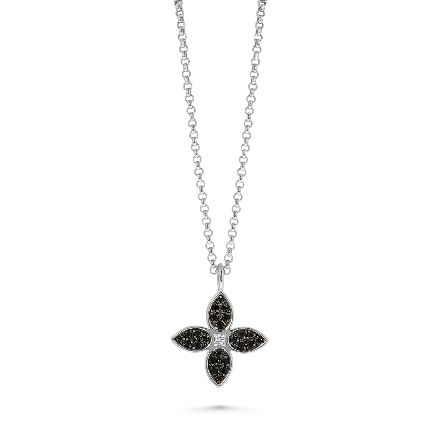 Colier din aur alb cu un diamant negru din colectia Diamonds by Siebel. Fabricat din aur alb de 14 karate, colierul este sertat cu diamante negre uimitoare. Pandantivul seamana cu un trifoi cu patru foi. Are 45 cm lungime. Asorteaza colierul cu alte piese din colectie.