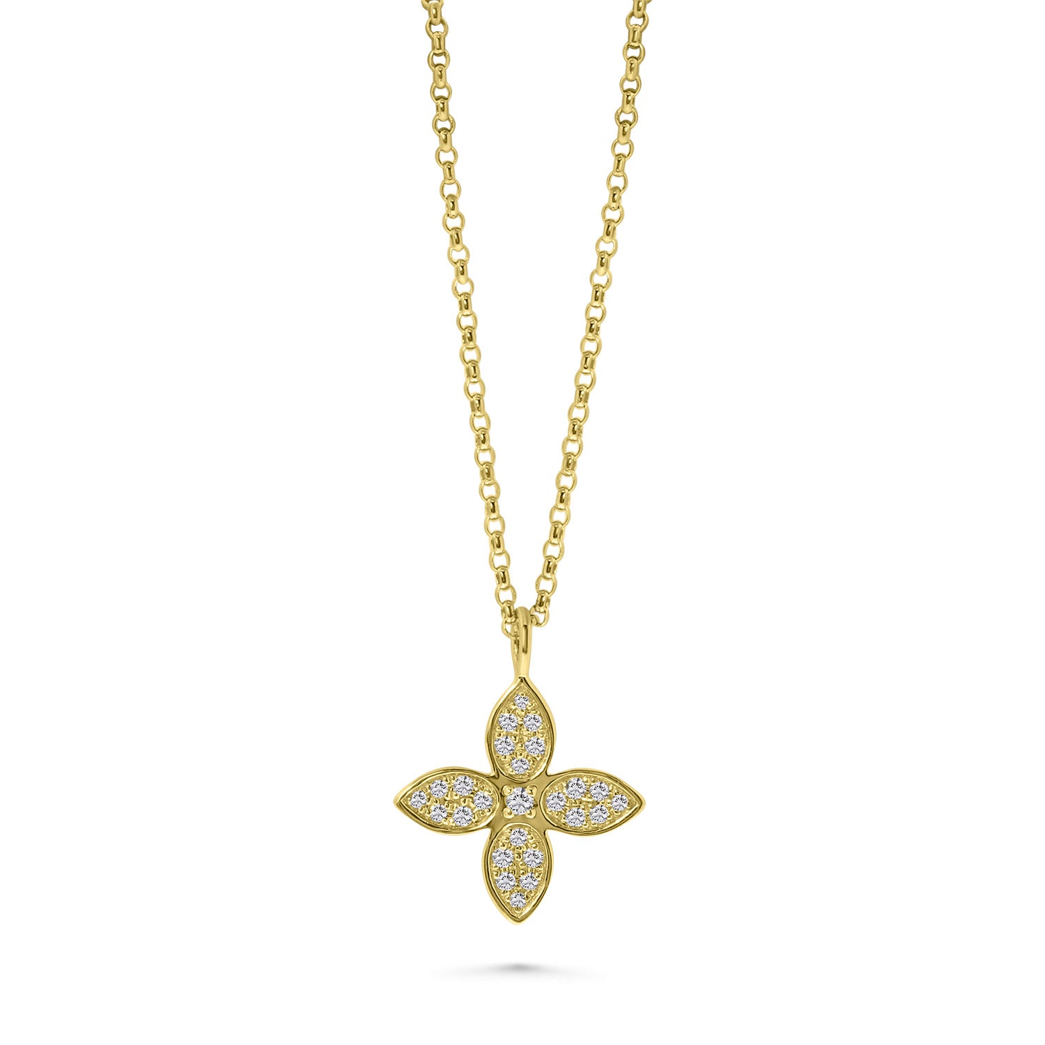 Colier cu trifoi din aur galben cu diamante din colectia Diamonds by Siebel. Fabricat din aur galben de 14 karate, colierul este sertat cu diamante frumoase. Pandantivul are forma unui trifoi. Lantul are 45 cm lungime. Asociati acest colier cu alte bijuterii din colectie.