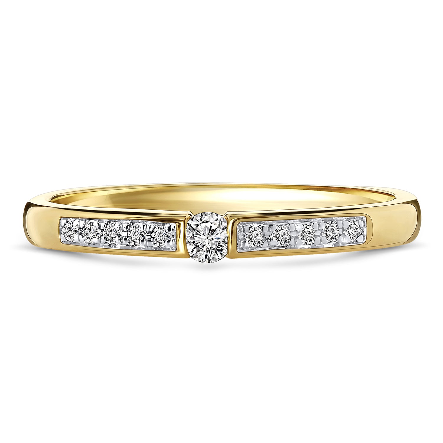 Inel cu diamante din aur galben de 14 karate din colectia Diamonds by Siebel. Inelul este sertat cu un diamant taiat stralucitor si 10 diamante taiate 8/8. Diamantele totale sunt de aproximativ 0,12 ct.