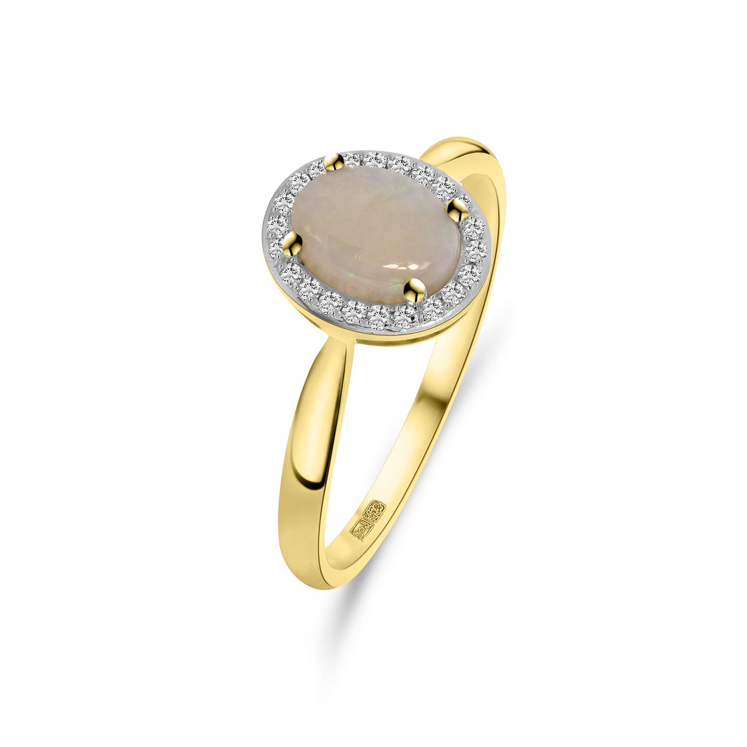 Inel din aur galben cu un opal oval (CMP) si anturaj de diamante din colectia Diamonds by Siebel. Fabricat din aur galben de 14 karate, inelul prezinta un compozit opal oval taiat convex, inconjurat de un anturaj de diamante taiate stralucitor. Asociati inelul cu alte bijuterii din colectie pentru a va completa look-ul.