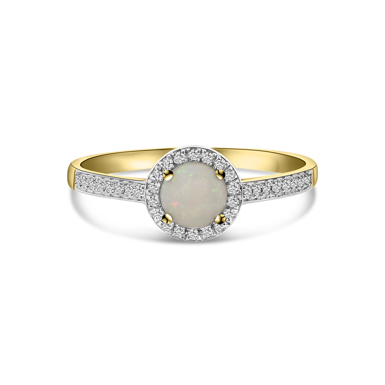 Inel din aur galben cu un opal rotund (CMP) si anturaj de diamante din colectia Diamonds by Siebel. Fabricat din aur galben de 14 karate, inelul prezinta un compozit opal rotund taiat convex, inconjurat de un anturaj de diamante taiat stralucitor. Asociati inelul cu alte bijuterii din colectie pentru a va completa look-ul.
