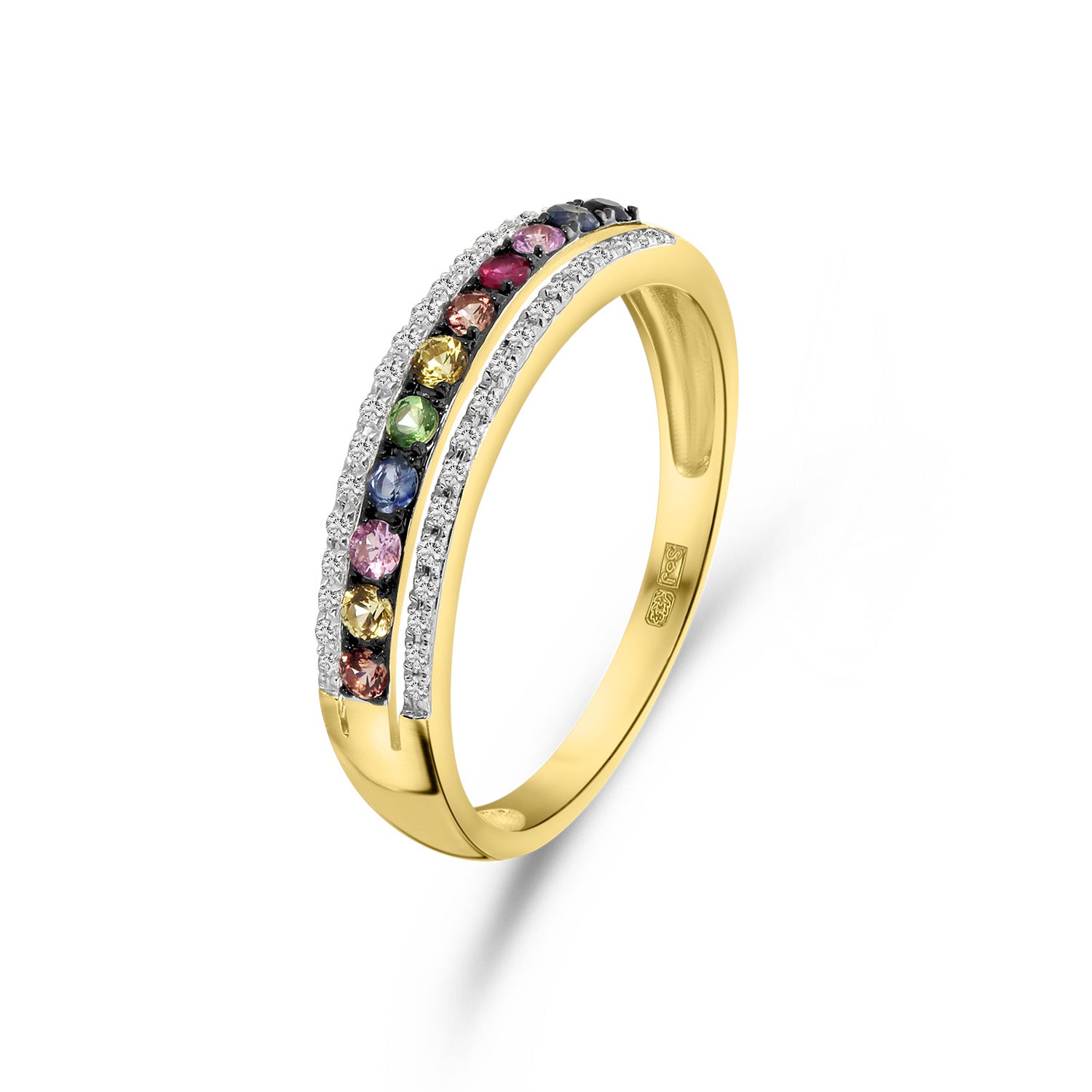 Inel din aur galben multicolor cu diamante din colectia Diamonds by Siebel. Fabricat din aur galben de 14 karate, inelul este sertat cu pietre de diferite culori, inclusiv rubine, safire, granate si diamante. Imperecheaza inelul cu cerceii cu clips asortati.