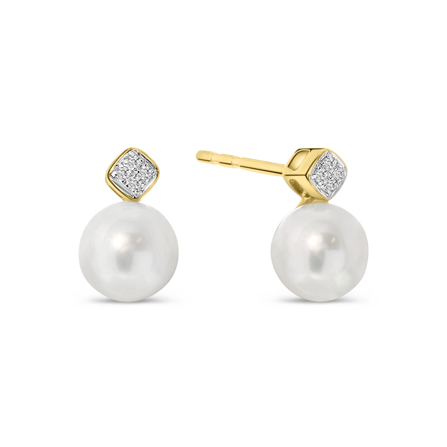 Adaugati o nota de rafinament look-ului dvs. cu acesti cercei stilati din aur galben de 14 karate. Perlele stralucitoare sunt imperecheate elegant cu un element patrat subtil, sertat cu diamante stralucitoare. O alegere atemporala care adauga fara efort clasa oricarei tinute. Asociati-le cu alte bijuterii din colectia Diamonds by Siebel pentru un aspect complet si luxos.