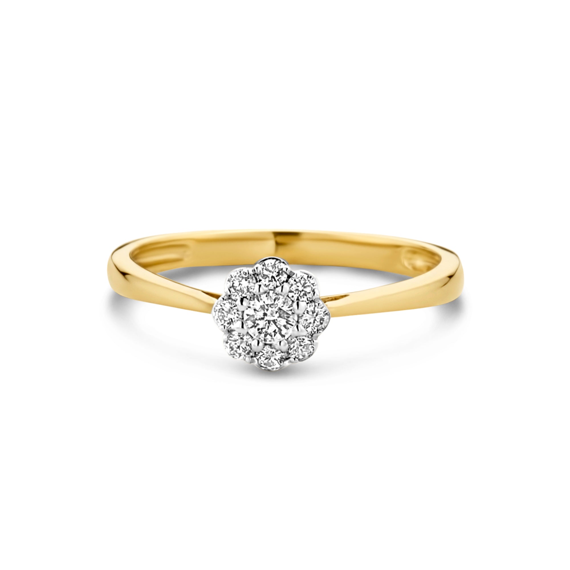 Inel flori din aur galben cu diamant din colectia Diamonds by Siebel. Fabricat din aur galben de 14 karate, inelul este sertat cu noua diamante uimitoare taiate stralucitor. Combina inelul cu alte piese din colectie pentru a-ti completa look-ul.