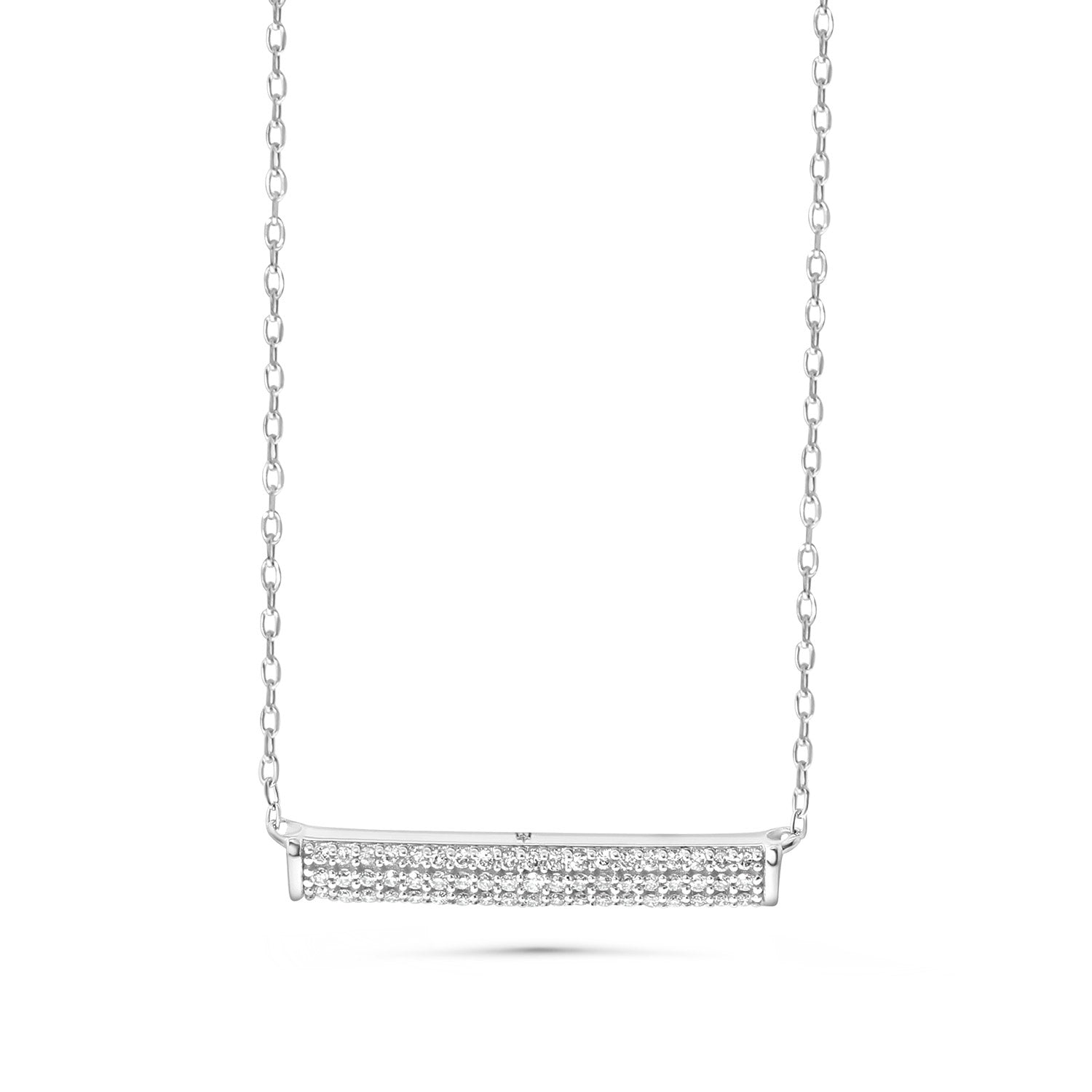 Colier din aur alb din colectia Diamonds by Siebel. Fabricat din aur alb de 14 karate, colierul are forma unei bare cu 57 de diamante taiate stralucitor. Lantul are 45 cm lungime.