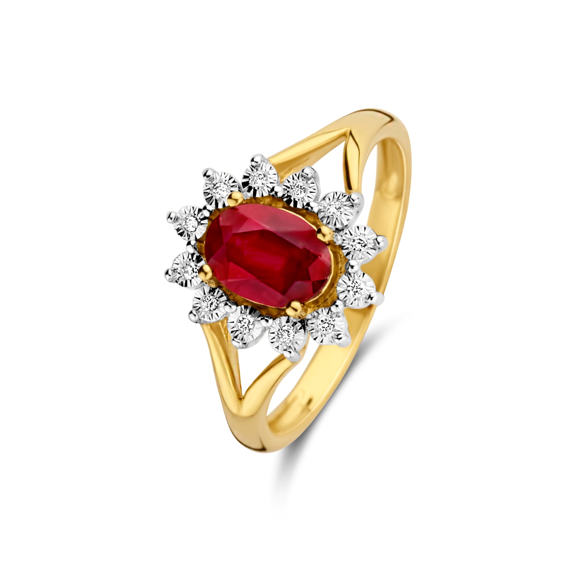 Acest frumos inel din aur de 14 karate de la Siebel este din colectia Gems. Are o piatra de rubin ovala uimitoare si este sertuita cu diamante frumoase. Este o adevarata atragere a ochiului. Asorteaza-l cu cerceii pentru un look elegant, luxos!