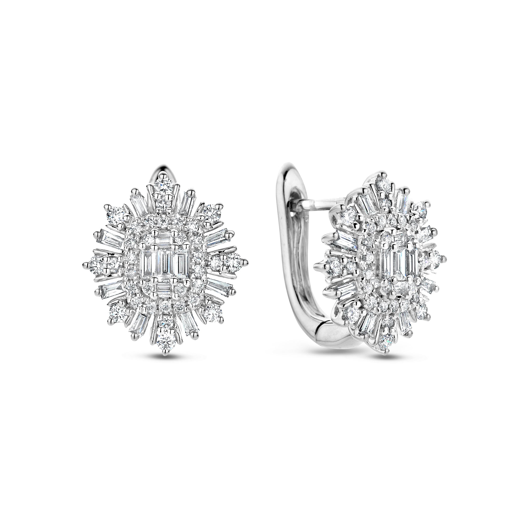 Cercei tip stift din aur alb cu o bagheta si diamante taiate stralucitor in valoare totala de 0,71 ct. Designul cu balamale se infasoara in jurul urechii si se fixeaza pe stift. Sclipirea diamantelor in diferite taieturi confera acestui inel un aspect frumos si luxos.