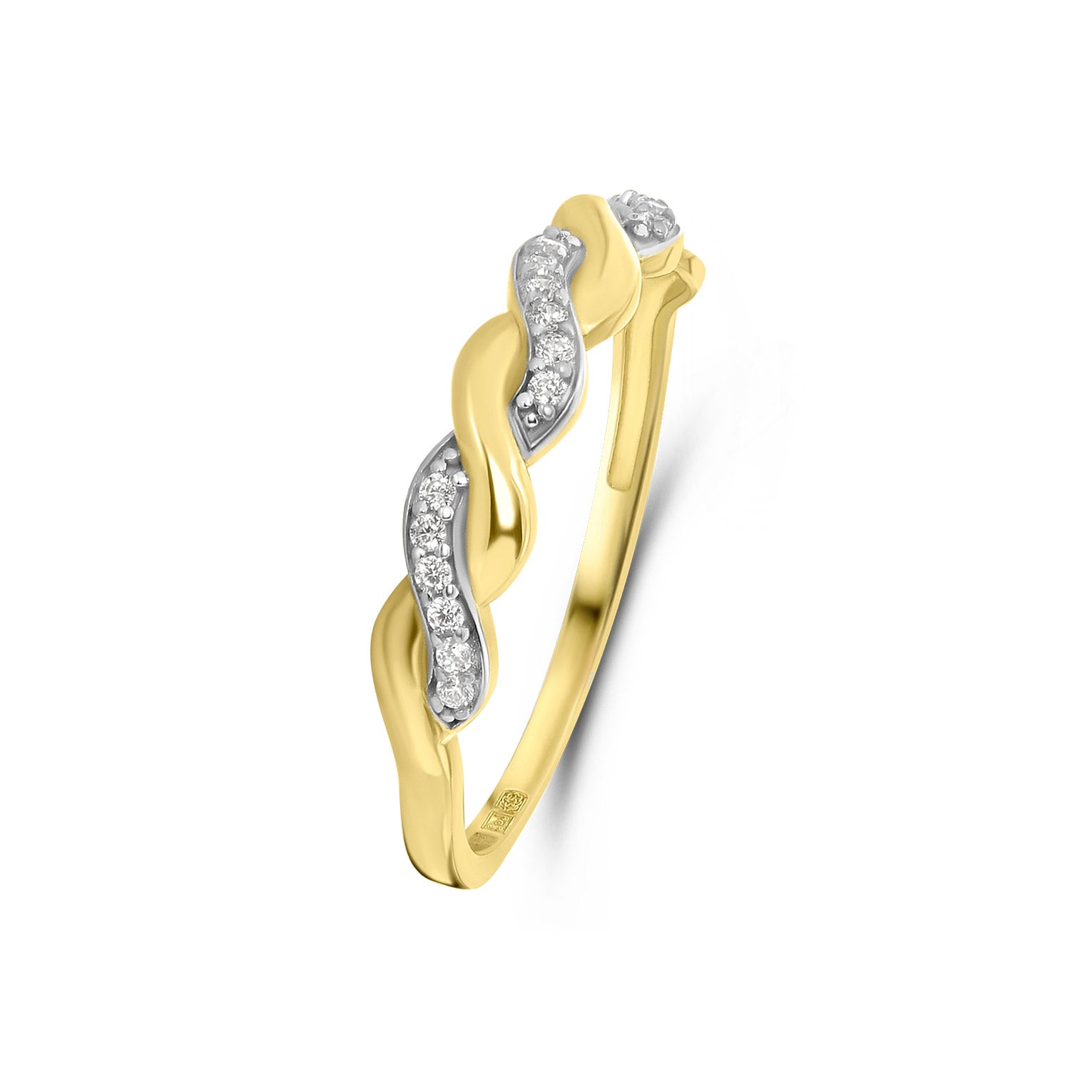 Inel bicolor din colectia Gold by Siebel. Confectionat din aur galben si alb de 14 karate, inelul este sertat cu 18 pietre uimitoare din zirconiu.