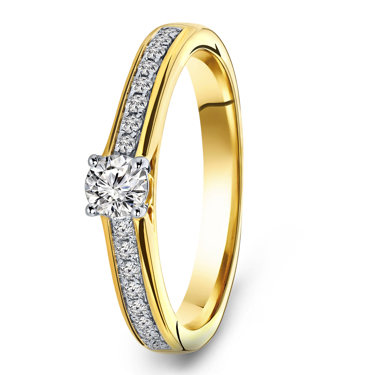 Inel din aur galben de 14 karate din colectia Diamonds by Siebel. Inelul este incrustat cu un diamant taiat briliant si 16 diamante taiate 8/8, cu o greutate totala de aproximativ 0,38 ct.