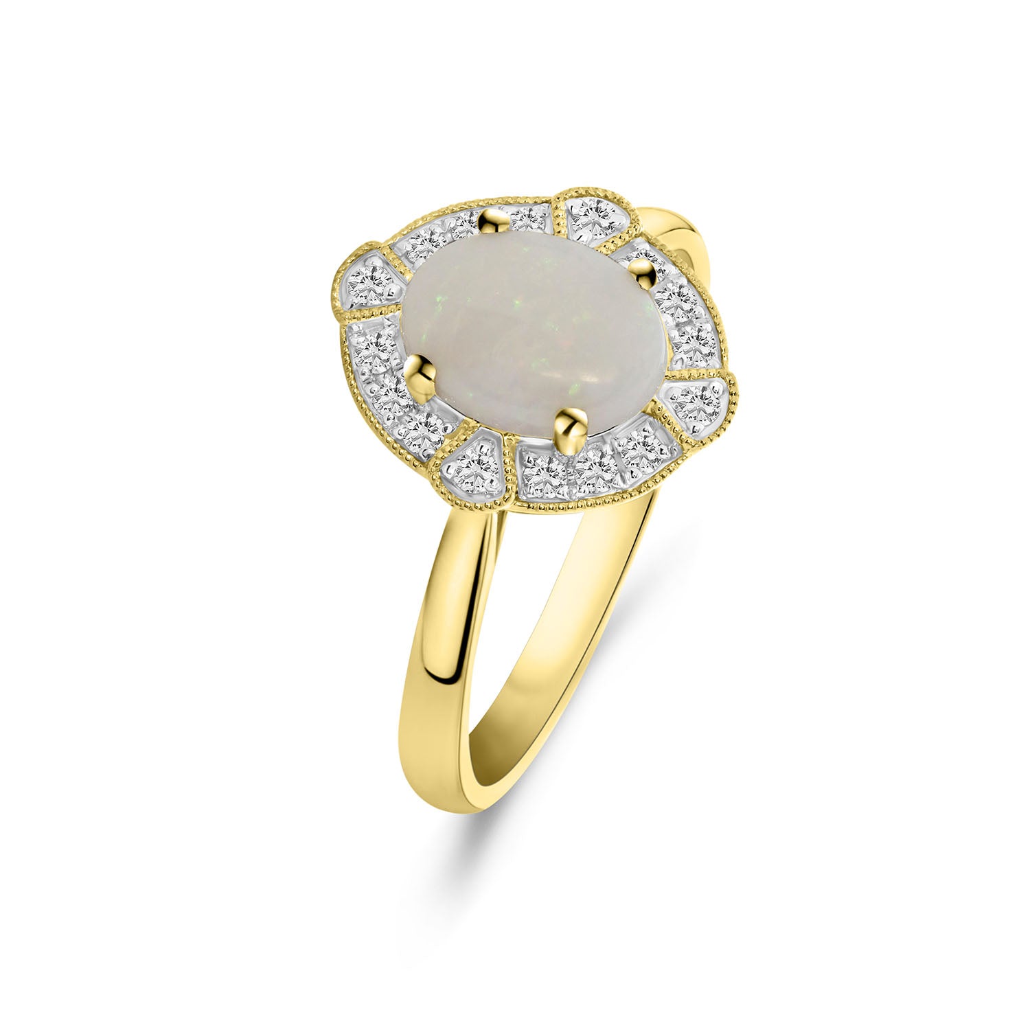 Inel cu aspect vintage din aur galben cu un CMP opal si diamante din colectia Diamonds by Siebel. Fabricat din aur galben de 14 karate, inelul are un compozit opal convex, inconjurat de diamante taiate stralucitor. Inelul are un aspect vintage.