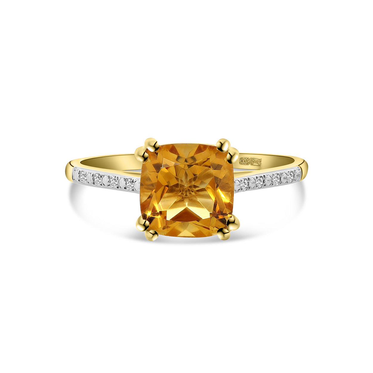 Inel din aur galben din colectia Gems. Confectionat din aur galben de 14 karate, inelul este sertat cu un citrin frumos, iar banda este sertata cu diamante albe stralucitoare. Asociati acest inel cu alte pietre din colectie.