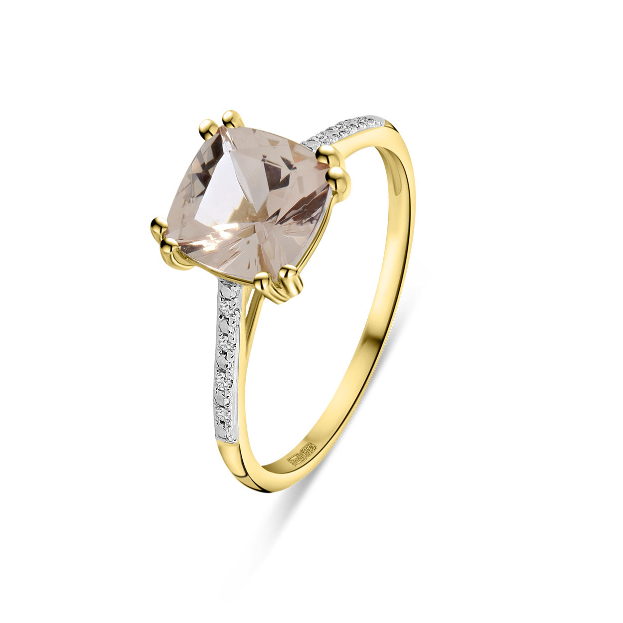 Inel din aur galben din colectia Gems. Confectionat din aur galben de 14 karate, inelul este sertat cu o frumoasa morganita, iar banda este incarcata cu diamante albe stralucitoare. Asociati acest inel cu alte pietre din colectie.