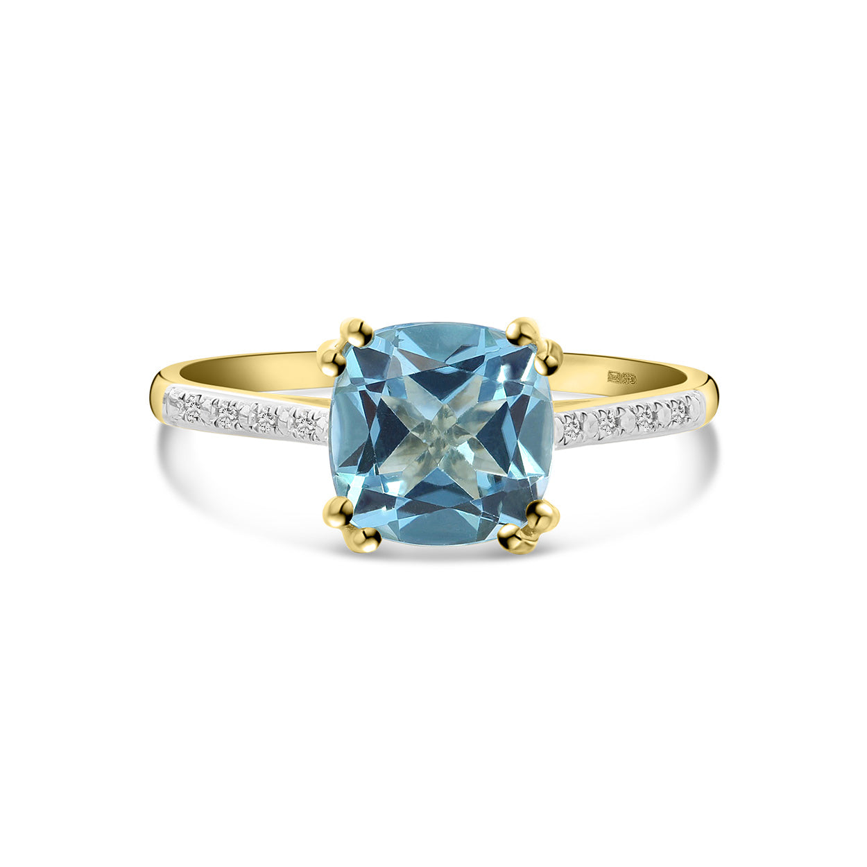 Inel din aur galben din colectia Gems. Fabricat din aur galben de 14 karate, inelul este sertat cu un superb topaz albastru deschis, iar trupa este incarcata cu diamante albe stralucitoare. Asociati acest inel cu alte pietre pretioase din colectie.