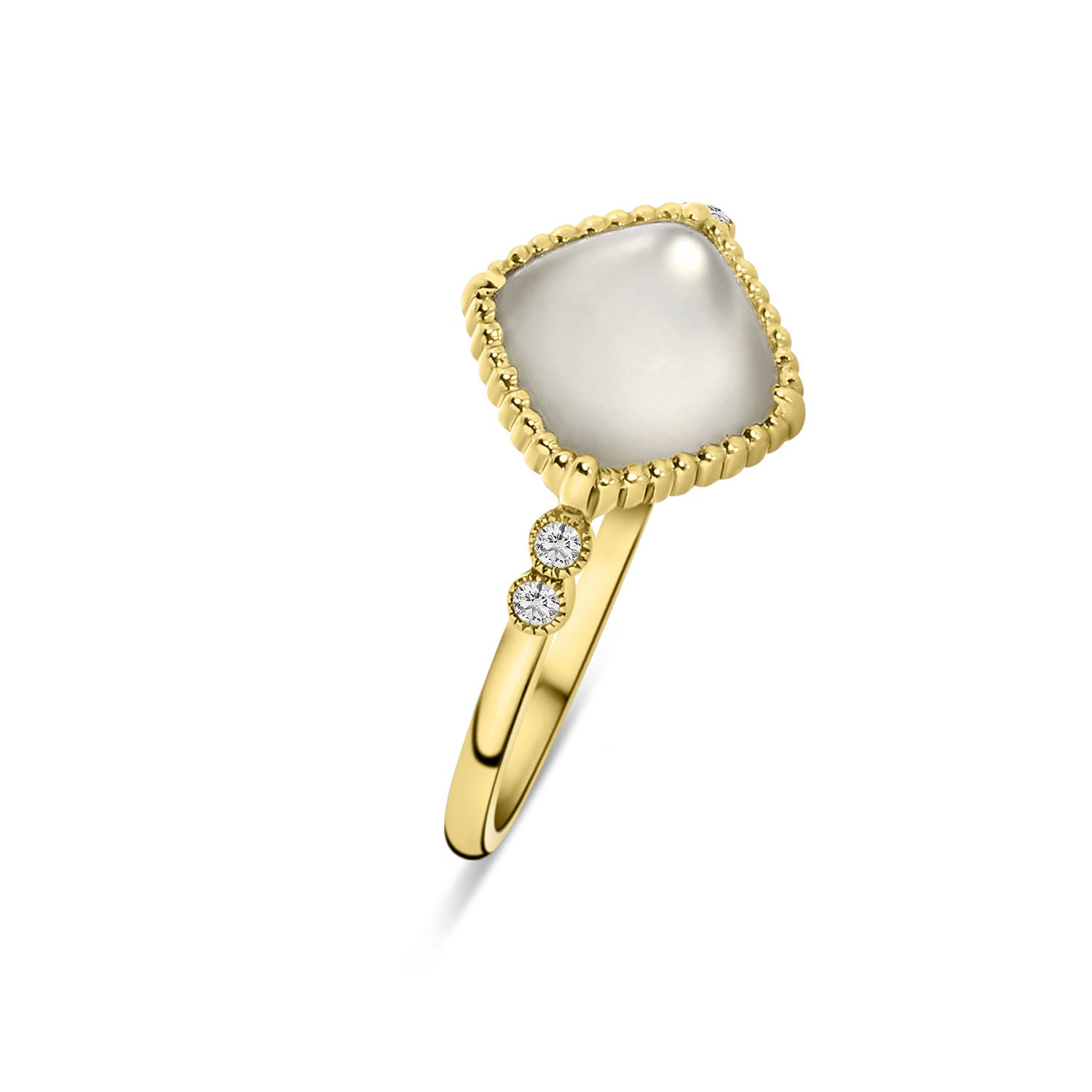 Fabricat din aur galben de 14 karate, acest inel feeric Gems emana eleganta pura. Un cuart frumos straluceste in centrul sau, incadrat de patru diamante taiate stralucitor care impodobesc subtil banda. Combinatia dintre stralucirea moale a cuartului si diamantele stralucitoare creeaza un aspect atemporal. O piesa de lux care adauga un farmec rafinat si irezistibil mainii tale.