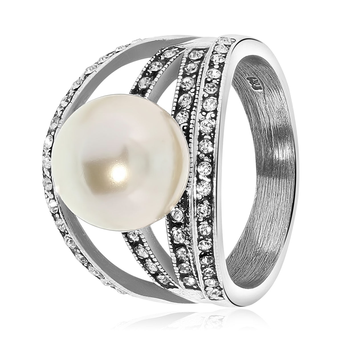 Inel din argint 925 din colectia Art Deco by Siebel. Acest inel atragator are o perla mare, un design larg si o multime de cristale Swarovski. Inelul are 2,2 cm latime si 1,1 cm grosime.