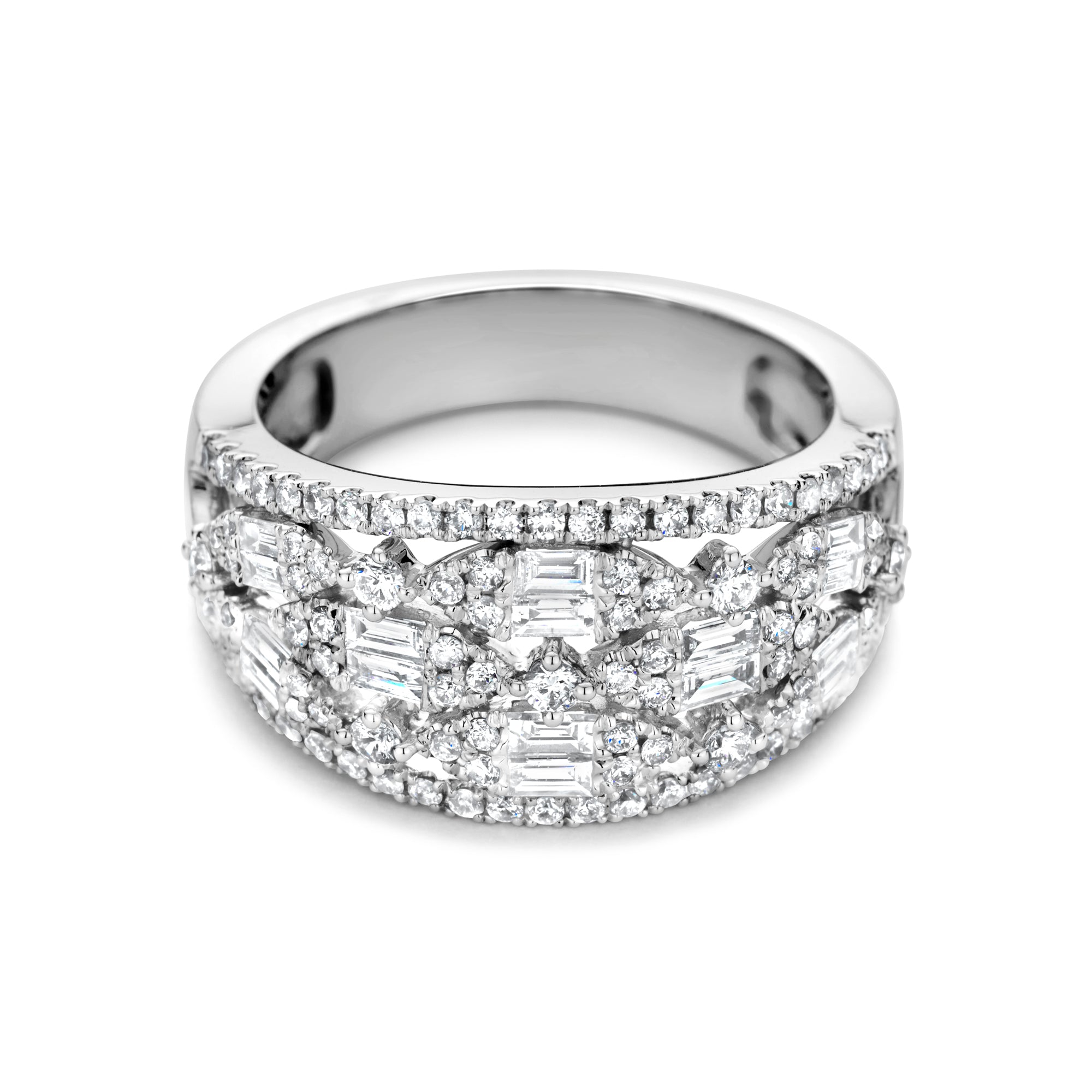 Inel din aur alb cu bagheta si diamante taiate stralucitor in valoare totala de 0,88 ct. Stralucirea diamantelor in diferite taieturi confera acestui inel un aspect frumos si luxos.