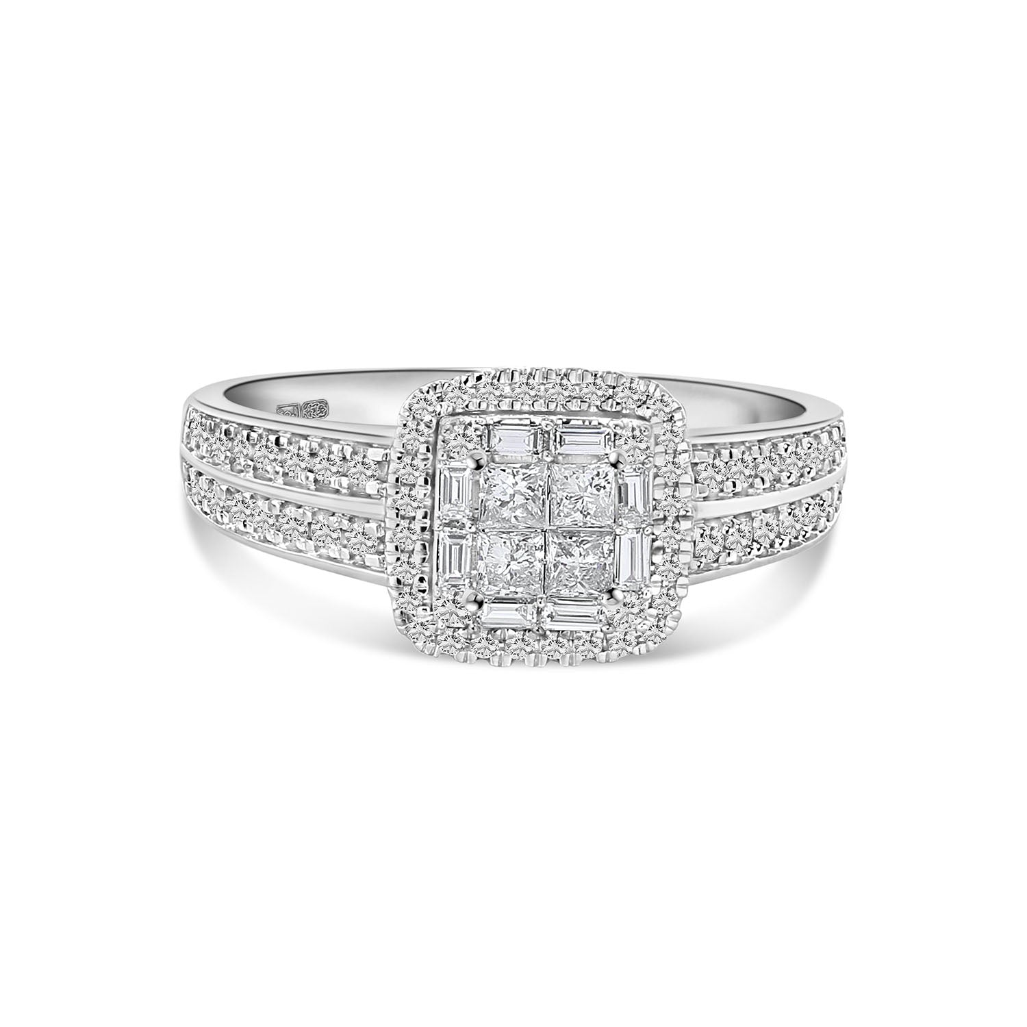 Acest uimitor inel din aur alb de 14 karate este sertat cu un total de 76 de diamante cultivate in laborator. Mai multe diamante taiate printesa stralucesc in centru, formand un singur grup. Un halou delicat de diamante taiate bagheta inconjoara acest lucru, creand un aspect geometric elegant. Trupa este impodobita cu diamante taiate stralucitor, oferind inelului un finisaj stralucitor. O creatie moderna si luxoasa, cu un amestec jucaus de croi.